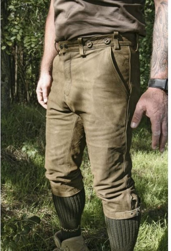 Pečlivě vypracované lovecké pumpky z pevné, robustní kůže s boční kapsičkou na nůž. V pase zapínání na dva pevné knoflíky. Konce nohavic lze utáhnout řemínky.