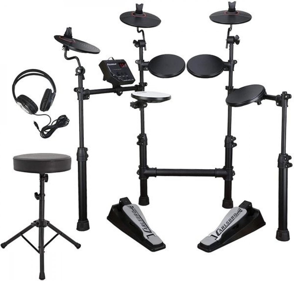 Elektronická bicí souprava Carlsbro CSD100 v paketu se sluchátky a stoličkou Sada elektronických digitálních bicích od britské firmy Carlsbro, která si buduje své pevné jméno na trhu s hudební elektronikou již od roku 1959. Hlavním rysem této sady je kompaktnost a dostupnost, což jí však neubírá na kvalitě. Zvukový modul Commander 100 má přednastavených 10 továrních bicích sad, 108 perkusních hlas...