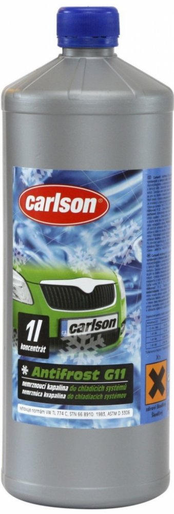 Carlson Antifrost G11 je nízkotuhnoucí chladící kapalina do chladících soustav spalovacích motorů z lehkých slitin. Směs Antifrost G11 je určena do chladičů automobilů na bázi monoetylénglykolu s antikorozními přísadami. Výhody: Celoročně chrání chladící systém motorového vozidla před působením mrazu a před korozí Zaručuje velmi dobrý převod tepla Neobsahuje dusitany, aminy a fosfáty Koncentrát 1:1, -38°C Antifrost G11 se plní do čistého chladícího systému podle postupu výrobce automobilu. Doporučená výměna je po třech letech.