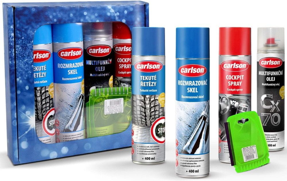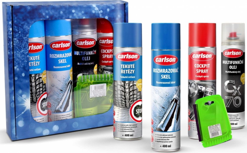 výhodná praktická dárková sada autokosmetiky Carlson v boxu Blue Edition, obsahuje Čistič palubní desky Carlson 400ml, Tekuté řetězy Carlson 400ml, Rozmrazovač skel 400ml, Multifunkční olej 400ml