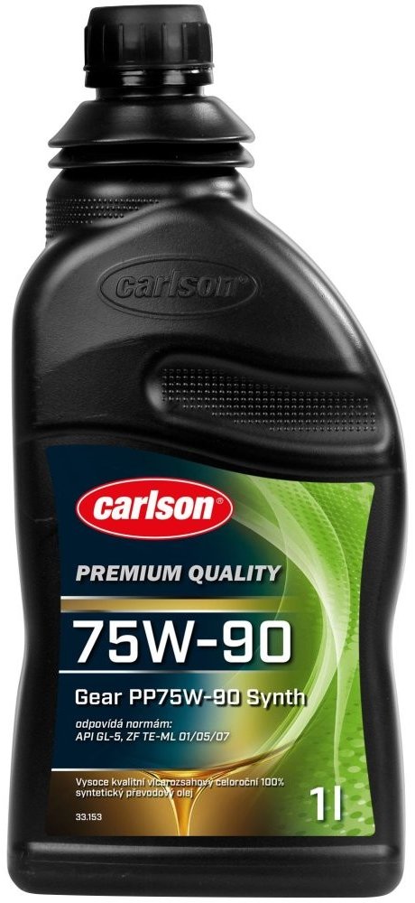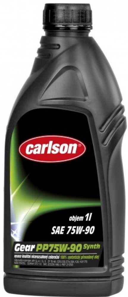 vysoce kvalitní vícerozsahový celoroční 100% syntetický převodový olej, vysoce kvalitní vícerozsahový celoroční 100% syntetický převodový olej, odpovídá specifikaci SAE 75W-90, odpovídá normám API GL-5, ZF TE-ML 01/05/07 CARLSON GEAR PP75W-90 SYNTH je plně syntetický vysoce výkonný převodový olej viskozitní třídy SAE 75W-90. Mezi jeho hlavní přednosti patří zvláště vysoká oxidační a viskozitní stabilita při vysokých teplotách, vysoká odolnost proti tvorbě pěny a velmi dobrá tekutost i při nízkých zimních teplotách, vysoký stupeň ochrany proti opotřebení a možnost tlakového zatížení, tlumí provozní hluky a chová se neutrálně vůči těsnícím materiálům, umožňuje intervaly pro výměnu oleje až 500.000 km. CARLSON GEAR PP75W-90 SYNTH je zvláště vhodný pro vysoce zatěžované pohony náprav moderních osobních a nákladních automobilů. Je vhodný pro mnoho synchronizovaných a nesynchronizovaných mechanických převodovek, hypoidní a planetové převody zadních náprav atd. za všech provozních podmínek