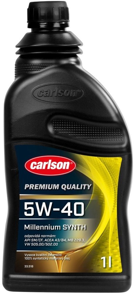 Díky tomu má vynikající tekutost při nízkých teplotách, velmi nízký odpor při startu, mimořádný index viskozity a velmi vysokou teplotní stabilitu. CARLSON® MILLENIUM SYNTH SAE 5W-40 je určený k mazání moderních benzínových a naftových (i přeplňovaných) motorů osobních automobilů a lehkých užitkových vozidel s mimořádnými požadavky na výkonnost oleje