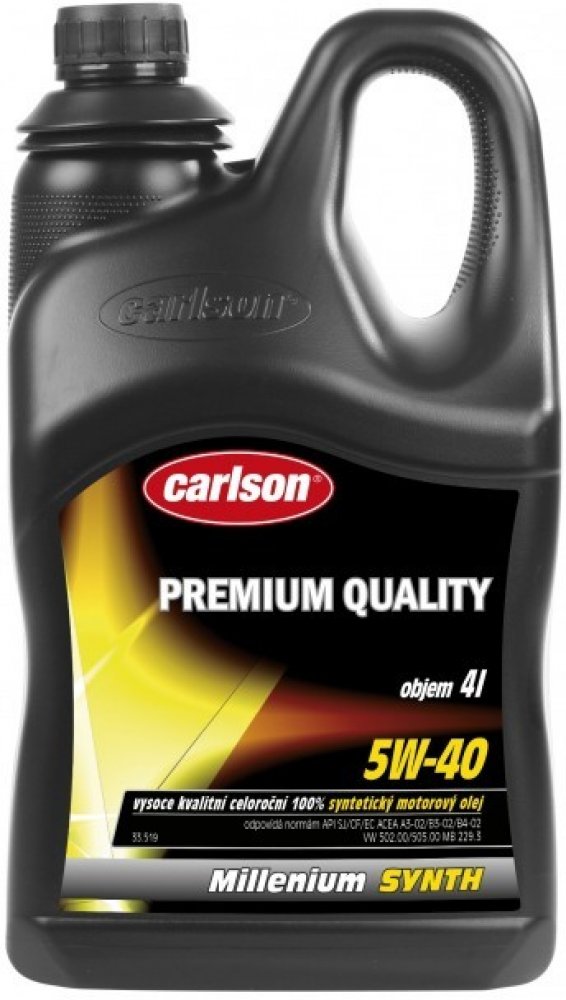 CARLSON MILLENIUM SYNTH SAE 5W-40 JE VYSOCE EXTRA VÝKONNÝ MOTOROVÝ OLEJ NEJNOVĚJŠÍ GENERACE, SPECIÁLNĚ NAVRŽENÝ TAK, ABY SPLŇOVAL NÁROČNÉ POŽADAVKY VÝROBCŮ. SKLÁDÁ SE Z NEKONVENČNÍCH ZÁKLADOVÝCH OLEJŮ A VYSOCE KVALITNÍCH ADITIV. DÍKY TOMU MÁ VYNIKAJÍCÍ TEKUTOST PŘI NÍZKÝCH TEPLOTÁCH, VELMI NÍZKÝ ODPOR PŘI STARTU, MIMOŘÁDNÝ INDEX VISKOZITY A VELMI VYSOKOU TEPLOTNÍ STABILITU. CARLSON MILLENIUM SYNTH SAE 5W-40 SE POUŽÍVÁ V BENZÍNOVÝCH MOTORECH OSOBNÍCH AUTOMOBILŮ, KTERÉ DOSAHUJÍ NEJVYŠŠÍHO VÝKONU. POUŽÍVÁ SE ROVNĚŽ DO NAFTOVÝCH MOTORŮ OSOBNÍCH AUTOMOBILŮ S TURBO A PŘÍMÝM VSTŘIKOVÁNÍM PALIVA. VYSOKÁ KVALITA UMOŽŇUJE PRODLOUŽENÉ INTERVALY VÝMĚNY V SOULADU S KONKRÉTNÍMI POŽADAVKY VÝROBCŮ.