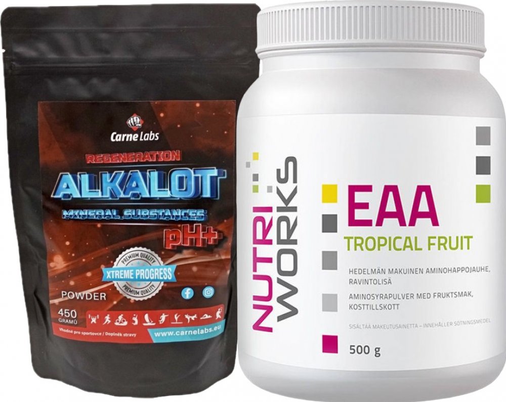 Ráno: 1/2 odměrky Alkalot + 1/2 odměrky EAA do 500 ml vody.