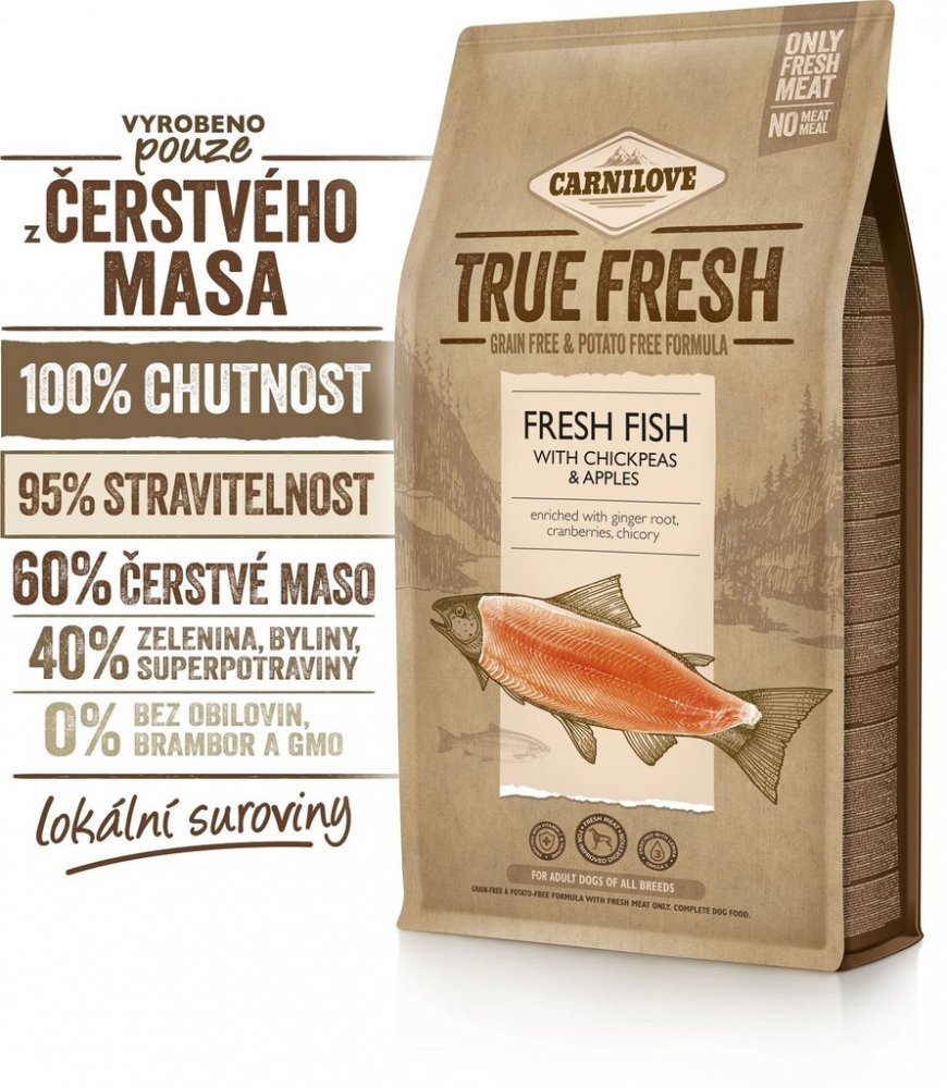 Carnilove Dog Fresh Fish je vysoce kvalitní holistické krmivo, jehož receptura obsahuje vysoký podíl masa ryb ze Severního moře i sladkovodních ryb z rybníků jižních Čech. Ryby pocházejí výhradně z udržitelně řízeného rybolovu. Přidaná cizrna je přirozeným zdrojem rostlinných bílkovin a minerálních látek nutných pro zdravý metabolismus. Jablka jsou vynikajícím zdrojem vlákniny nezbytné pro celkové zdraví zažívacího traktu. Zázvor a brusinky poskytují důležité antioxidanty a pomáhají budovat silnou přirozenou imunitu, zatímco kořen čekanky plní díky obsahu inulinu funkci prebiotika. Krmivo obsahuje maso divokého původu, lesní plody, zeleninu a bylinky. Neobsahuje obiloviny ani brambory. Jedinečná chuť rybího masa uspokojí přirozenou psí touhu po chuti masa.