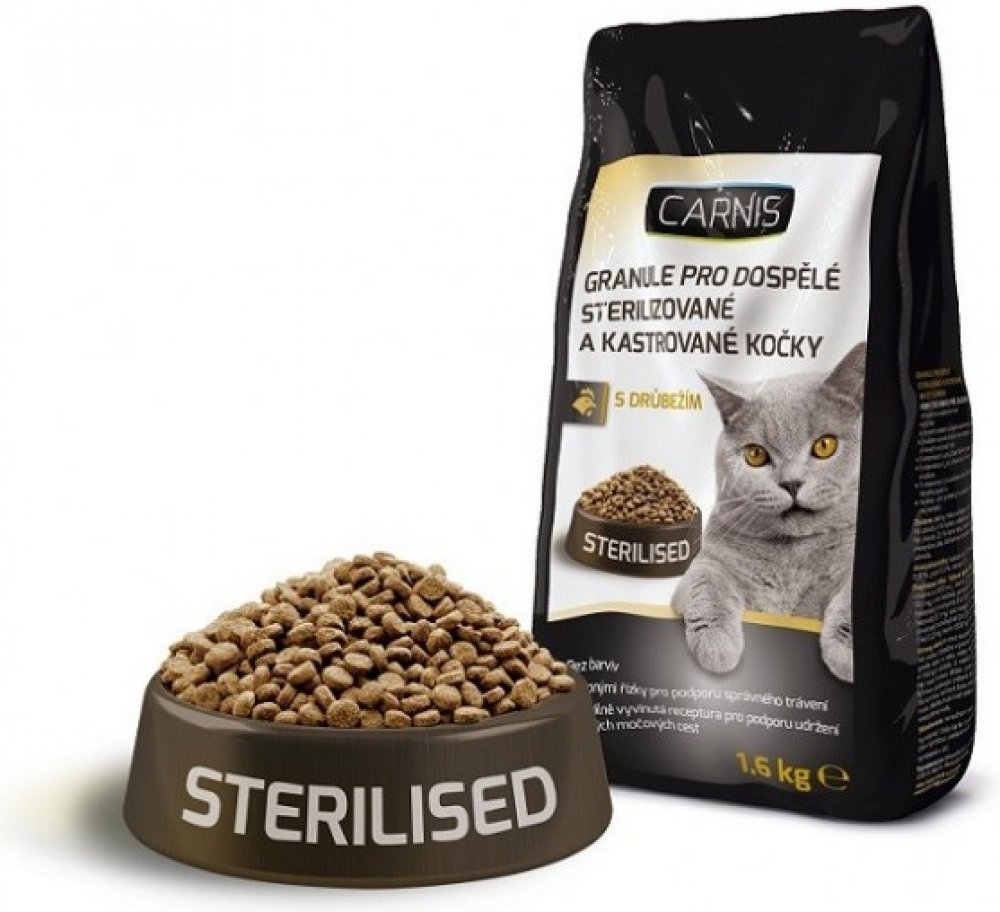Masité drůbeží granule CARNIS představují pro sterilizované a kastrované kočky ideální řešení, neboť byly vyvinuty speciálně na podporu zdravých močových cest. Tyto granule pro kastrované kočky obsahují potřebné proteiny, jež zajistí dobrou fyzickou kondici, ale také řepné řízky podporující správné trávení, díky kterým nebude kočka nadměrně přibývat na váze. Kompletní a vyvážené krmivo navíc obsahuje: