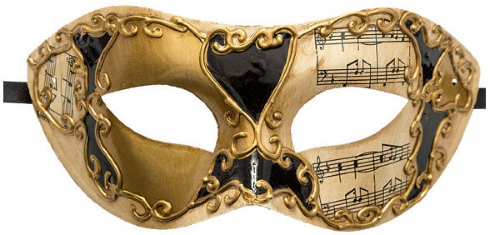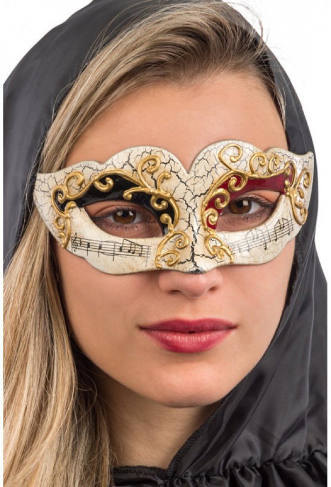 Benátská karnevalová polomaska Benátská karnevalová maska, z béžového plastu, zdobená zlatou výšivkou v reliéfu, černými a červenými dekoracemi a notami. Vhodné ke kostýmu ve stylu benátského karnevalu. Materiál: plast Velikost: dospělá Uvázání na stužku