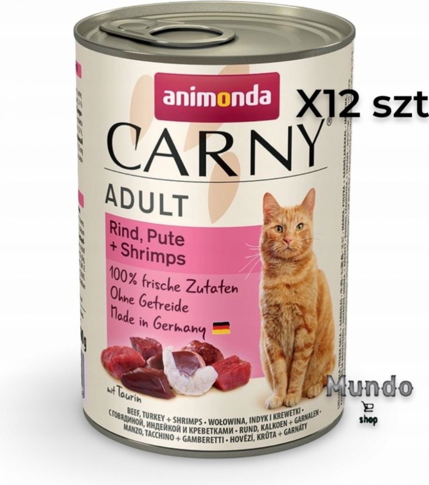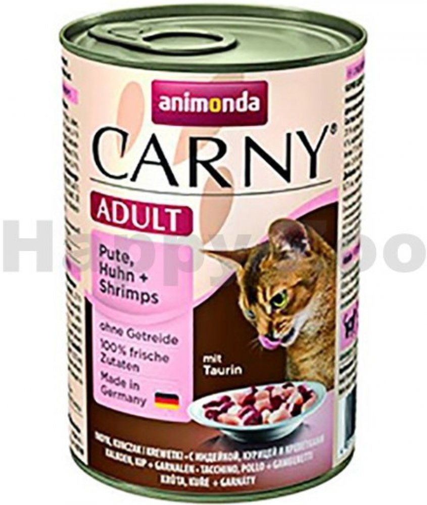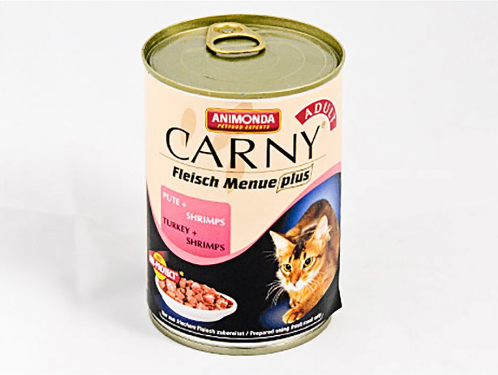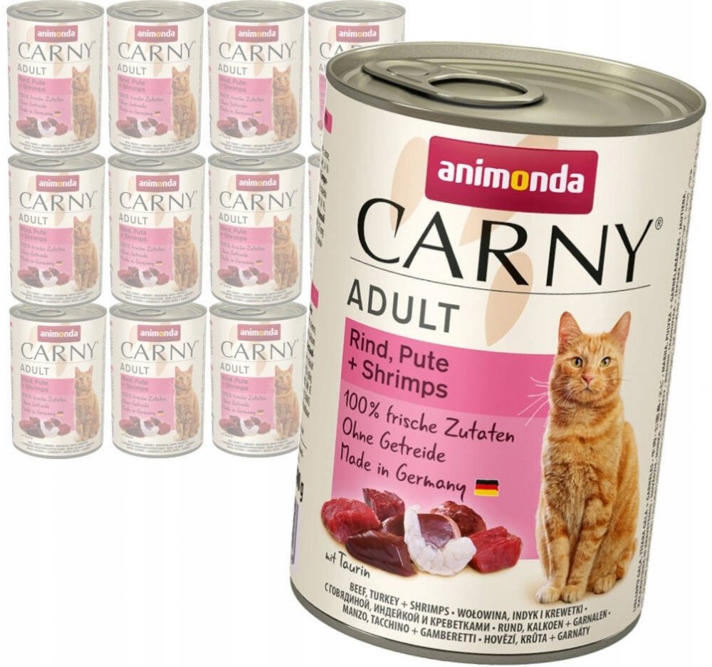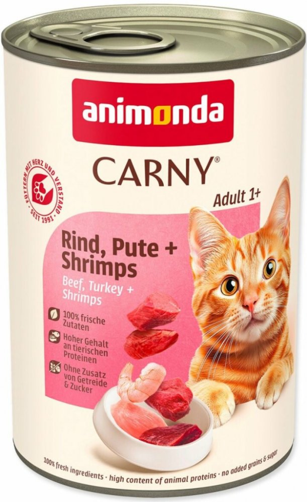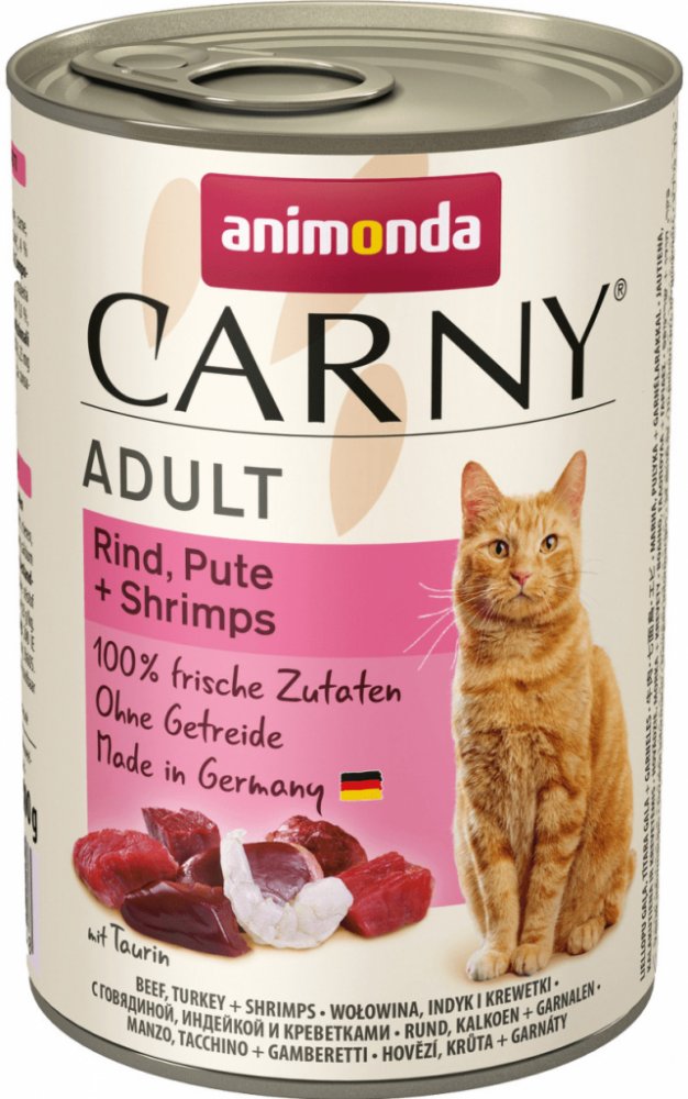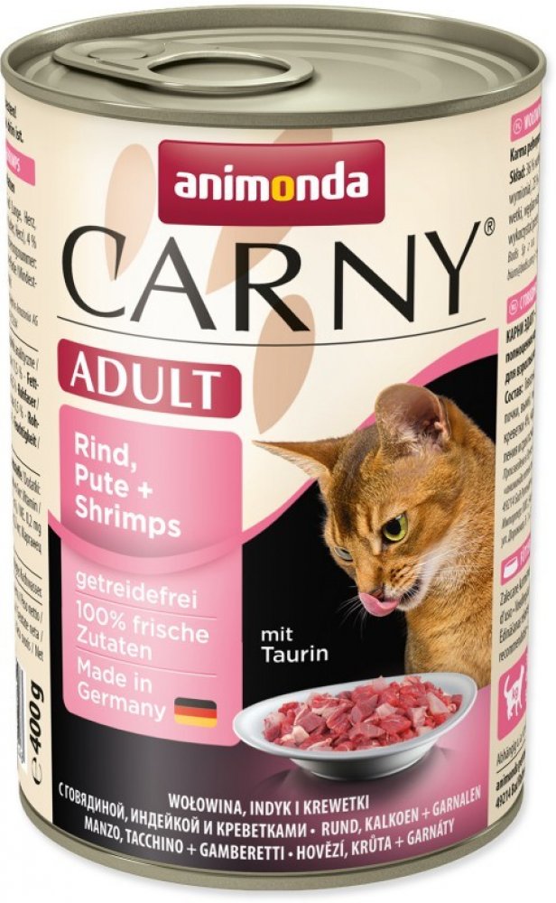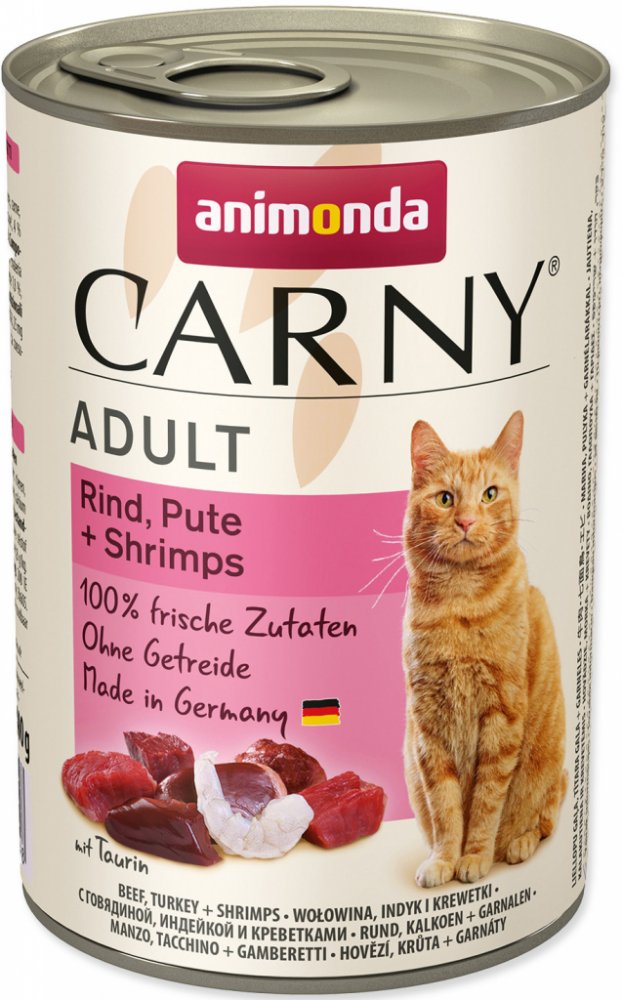 Konzerva s hovězím masem, krůtou a krevetami. Kompletní krmivo pro dospělé kočky. Krmný návod: kočkám o hmotnosti 3 kg podávejte 175 g, kočkám o hmotnosti 4 kg podávejte 200 g a kočkám o hmotnosti 5 kg podávejte 245 g denně. Složení: 36% hovězího masa (plíce, srdce, maso, ledviny, vemeno), 25% krůta (játra, srdce), 4% krevety, uhličitan vápenatý. Jakostní znaky: hrubé proteiny 11,5%, vlhkost 79%, hrubé oleje a tuky 6,5%, hrubé popeloviny 1,8%, hrubá vláknina 0,5%, vitamín D3 200 m.j./ kg, taurin 0,8 g / kg, jód 0,2 mg / kg, magnezium 1,5 mg / kg, zinek 10 mg / kg.