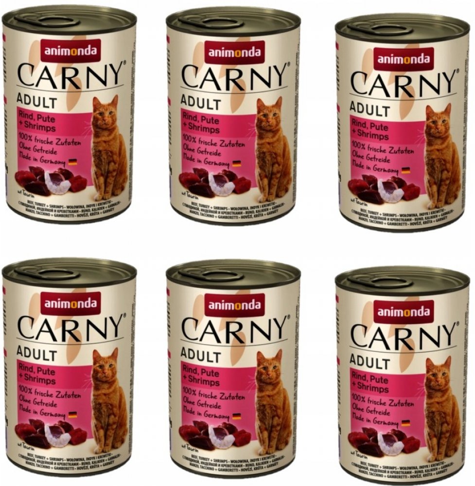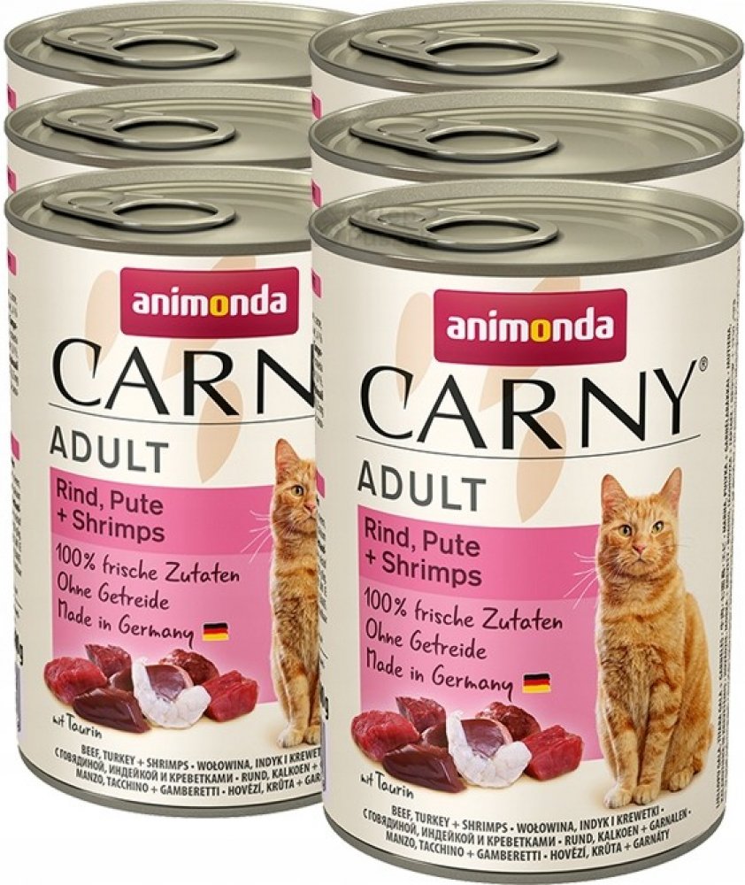 Konzerva s hovězím masem, krůtou a krevetami. Kompletní krmivo pro dospělé kočky. Krmný návod: kočkám o hmotnosti 3 kg podávejte 175 g, kočkám o hmotnosti 4 kg podávejte 200 g a kočkám o hmotnosti 5 kg podávejte 245 g denně. Složení: 36% hovězího masa (plíce, srdce, maso, ledviny, vemeno), 25% krůta (játra, srdce), 4% krevety, uhličitan vápenatý. Jakostní znaky: hrubé proteiny 11,5%, vlhkost 79%, ...
