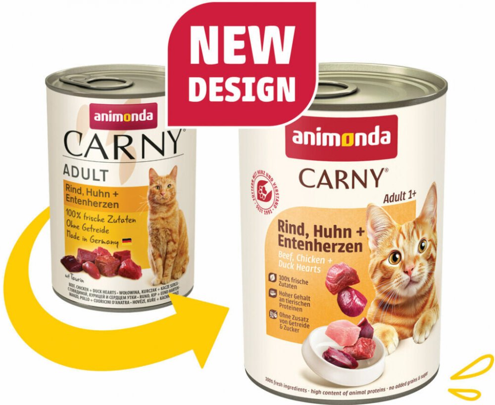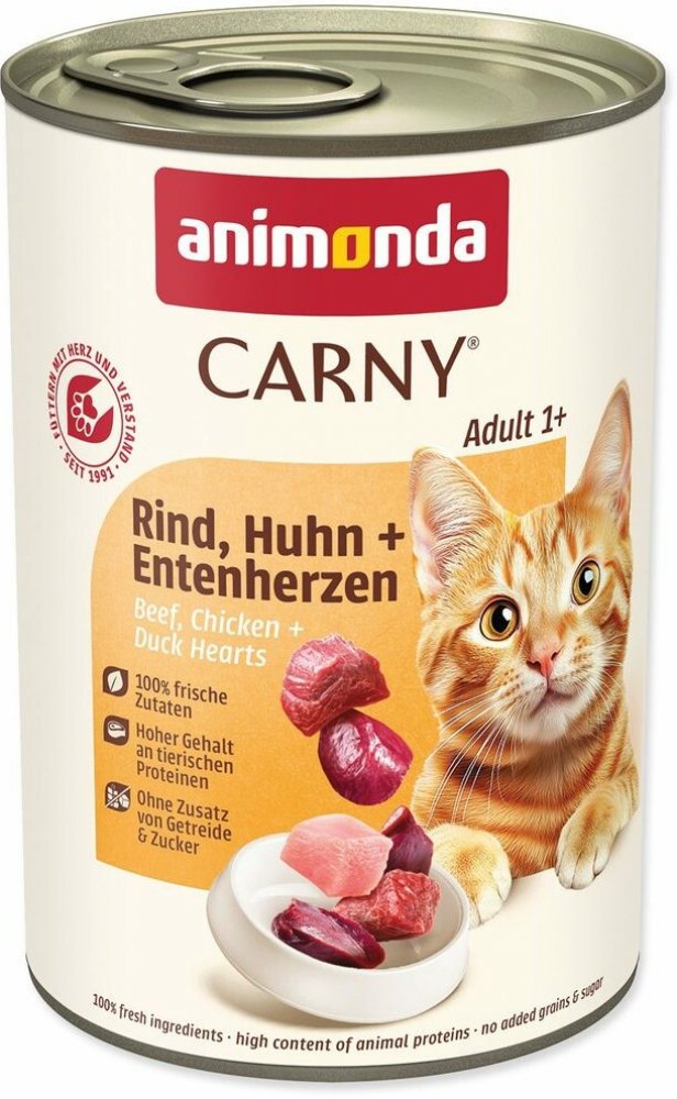 Složení konzervy Animonda CARNY Adult: 84% hovězího, kuřecího 9%, 5% kachna, minerální látky.