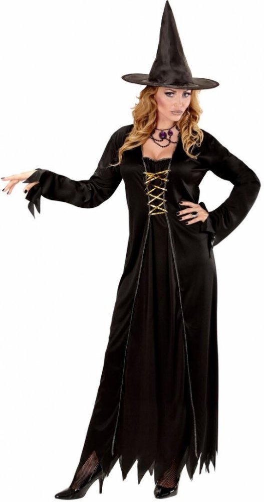 Karnevalový kostým čarodějnice s kloboukem, se zlatým šněrováním. Velice elegantní kostým z vás udělá krásnou čarodějnici, která přitáhne pohledy ostatních účastníků karnevalu, firemního večírku, nebo pálení čarodějnic.