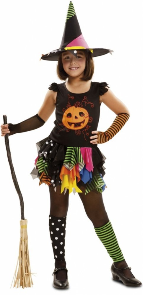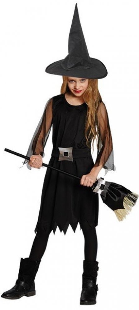 Karnevalový kostým čarodějnice s kloboukem, se zlatým šněrováním. Velice elegantní dětský kostým z vaší slečny udělá krásnou čarodějnici, která bude hvězdou karnevalu, nebo pálení čarodějnic.