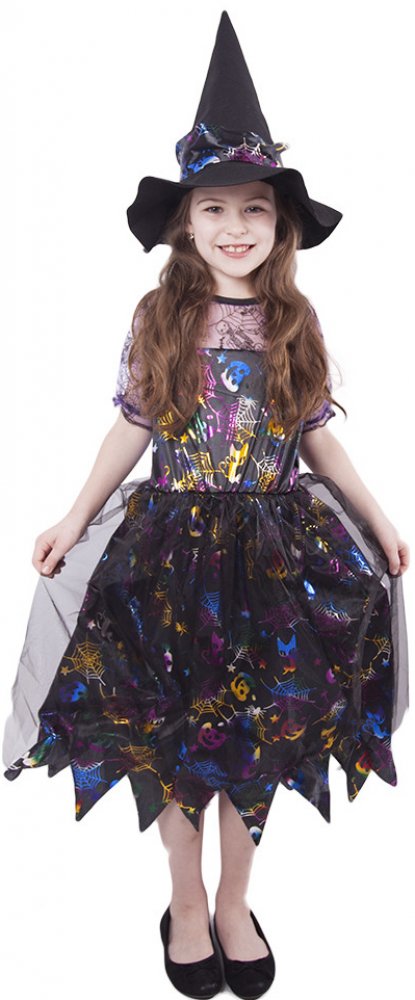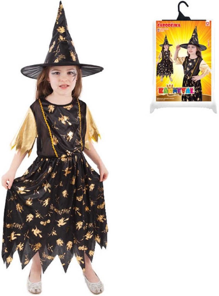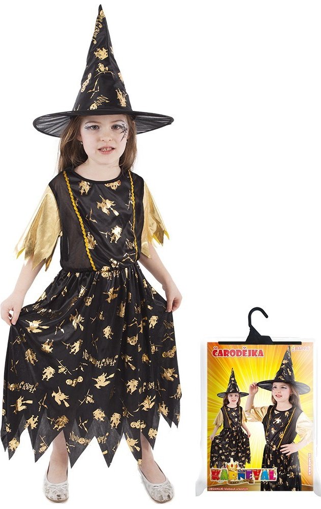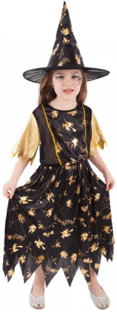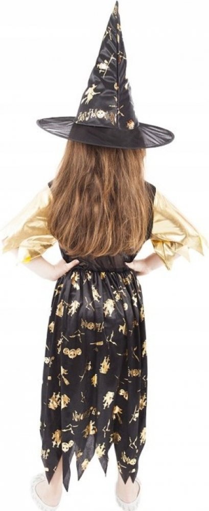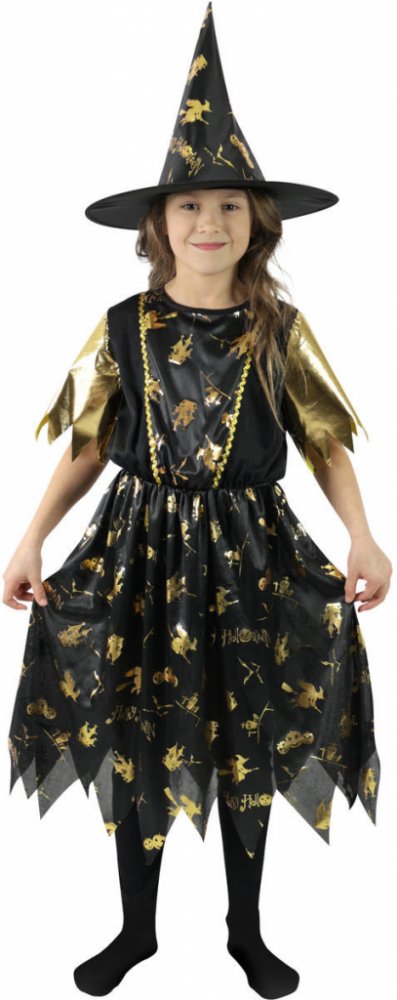Halloweenský kostým pro malé čarodějnice! Kostým černo-zlaté barvy ve velikosti M je určen pro holčičky ve věkovém rozmezí 6-8 let (116-128 cm). Šaty jsou dekorovány zlatými halloweenskými motivy. Součástí kostýmu je perfektně sladěný čarodějnický klobouk. S tímto úchvatným kostýmem se zaručeně staneš hvězdou karnevalu i Halloweenu!