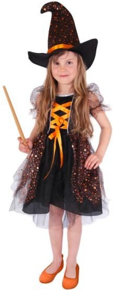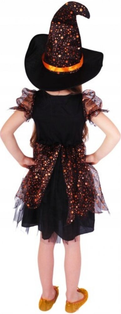 Magický karnevalový kostým pro malé čarodějnice! Kostým černé barvy ve velikosti L je určen pro holčičky ve věkovém rozmezí 8-10 let (128-140 cm). Šaty jsou dekorovány oranžovými stuhami a metalickými hvězdičkami. Součástí kostýmu je perfektně sladěný čarodějnický klobouk. S tímto úchvatným kostýmem se zaručeně staneš hvězdou karnevalu i Halloweenu!