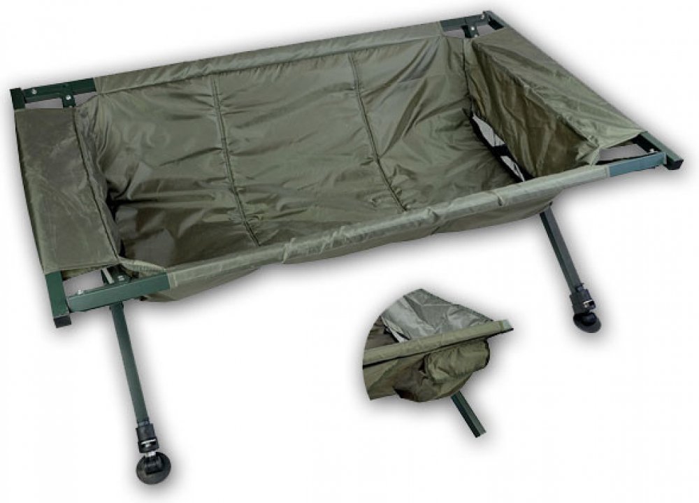 Všichni jistě znáte problémy s odháčkováním ryb. Ryba sebou neustále šije a občas hrozí, že Vám skončí háček v ruce. Proto je vhodné mít po ruce tuto čtyrnohou kolébku pod ryby. Je vyrobena z hliníku, proto má lehkou a pevnou konstrukci. V hluboké vaničce kolébky bude uvězněna téměř každá ryba bez šance uniknout. Proto ji můžete velice snadno odháčkovat. Ve vaničce kolébky jsou dvě postranní odtokové síťky, které dovolí vodě lehce odtéct. Díky tomu se Vám bude snadno s rybou pracovat. Čtyři nastavitelné nohy Vám zaručí stabilitu v jakémkoliv terénu. Spodní část nohou je možno posunout o 7 centimetrů, tím snadno vyrovnáte vaničku do stabilní polohy. Boční kapsa poskytuje dostatek prostoru pro uložení nástrojů, například pro odháčkování či měření.