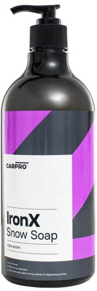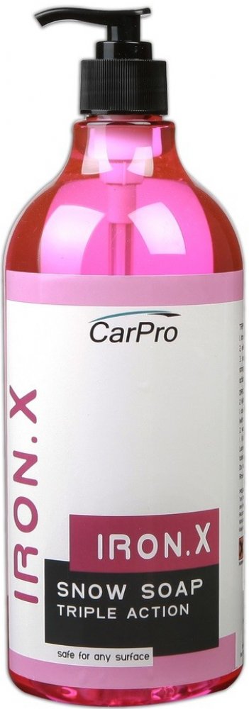 CarPro Iron X Snow Soap - 1000 ml CarPro Iron X Snow Soap je jediný autošampon na trhu, který má schopnost (při doporučené koncentraci) rozpouštět polétavou rez (vzdušnou korozi). Přípravek skvěle odstraňuje zbytky zaschlého hmyzu, staré vosky, vzdušnou korozi. Lze jej používat na lakovaných, kovových, skleněných, plastových a pryžových površích. CarPro Iron X Snow Soap má vynikající lubrikační schopnosti, čímž minimalizuje riziko poškrábání. Může být použit jako automobilový šampon nebo jako aktivní pěna. Při použití koncentrovaného přípravku v pěnovači se vytváří velmi hustá, nestékává pěna a účinně tak uvolňujíe a rozpouští nečistoty. Tím je usnadněno následné mytí. Pokud přípravek použijeme jako klasický auto šampon, ředíme jej v poměru 1 : 8. Díky schopnosti odstranit polétavou rez, je Iron X Snow Soap také velmi účinný při čištění kol, kam se aplikuje neředěný přímo na mycí kartáč, rukavici či houbu.