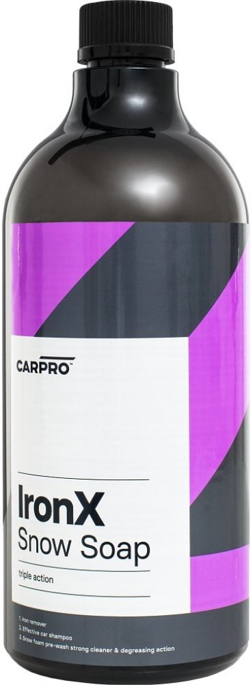 CarPro Iron X Snow Soap - 1000 ml CarPro Iron X Snow Soap je jediný autošampon na trhu, který má schopnost (při doporučené koncentraci) rozpouštět polétavou rez (vzdušnou korozi). Přípravek skvěle odstraňuje zbytky zaschlého hmyzu, staré vosky, vzdušnou korozi. Lze jej používat na lakovaných, kovových, skleněných, plastových a pryžových površích. CarPro Iron X Snow Soap má vynikající lubrikační sc...