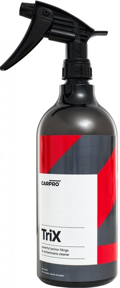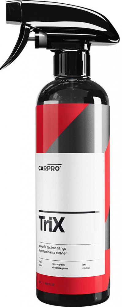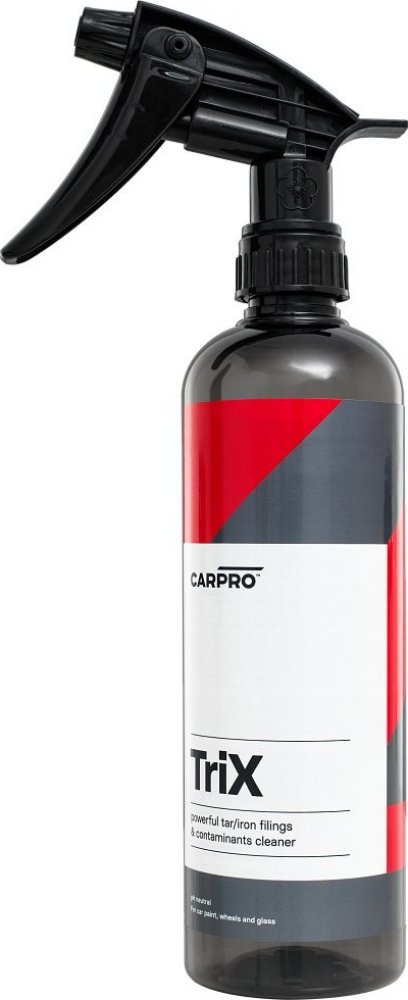 Za cenu jen mírně sníženého účinku přináší úsporu pracovních kroků, a tedy času i peněz. Snadno a bezpečně odstraňuje asfaltové skvrny i zkorodované částice železného prachu (tzv. polétavou rez či vzdušnou korozi) z povrchu laku a dalších materiálů – skla, chromu apod. CarPro TRIX je velmi účinný na čištění disků kol.