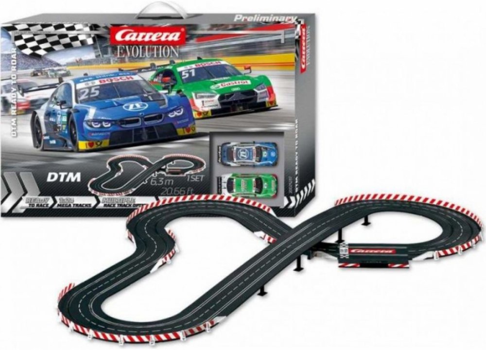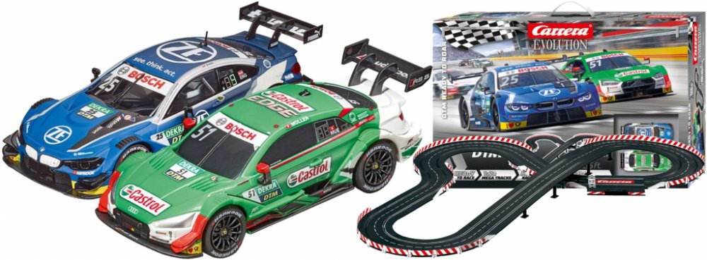 Autodráha Carrera EVOLUTION dlouhá 6,3m s auty BMW M4 DTM a Audi RS 5 DTM obsahuje rovinky, zatáčky, přemostění, ovladače rychlosti a další díly.