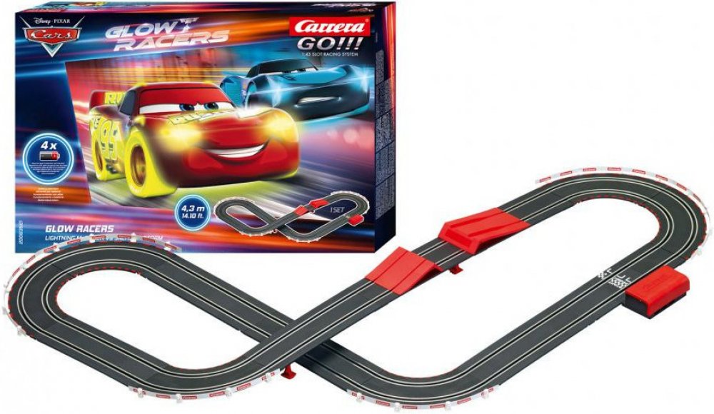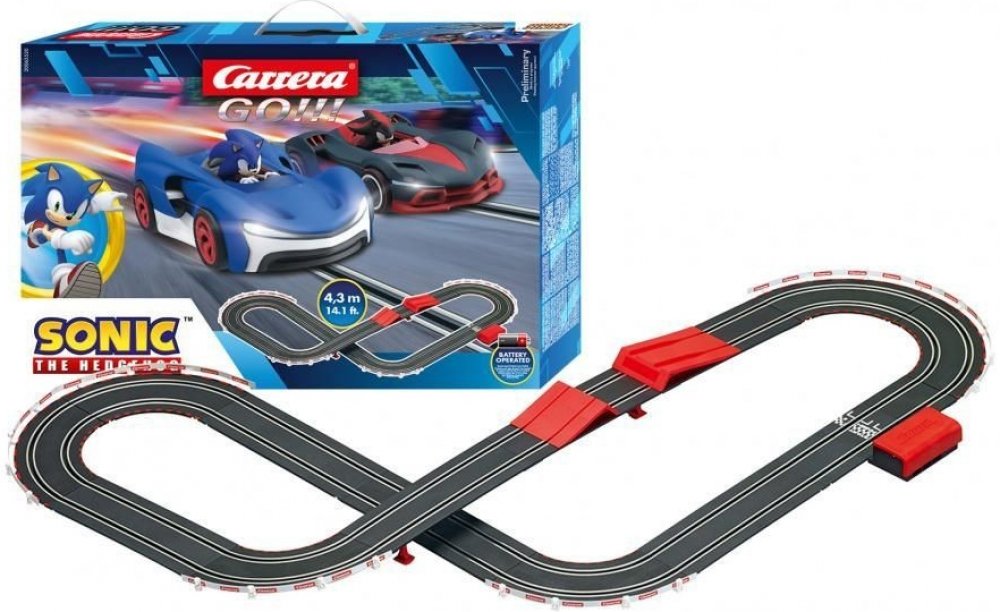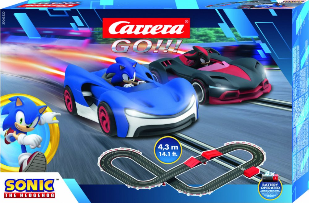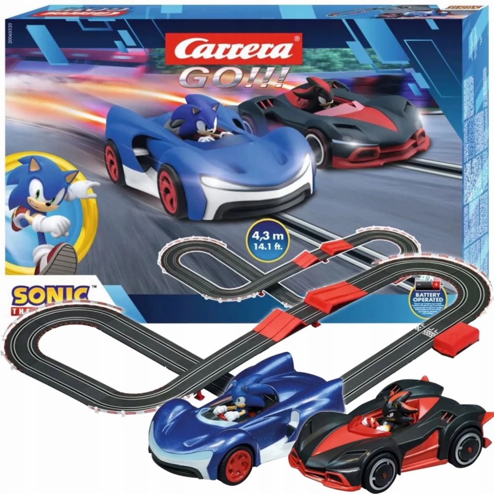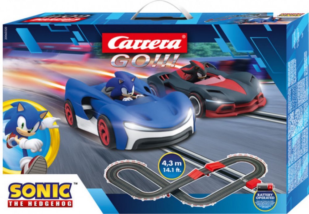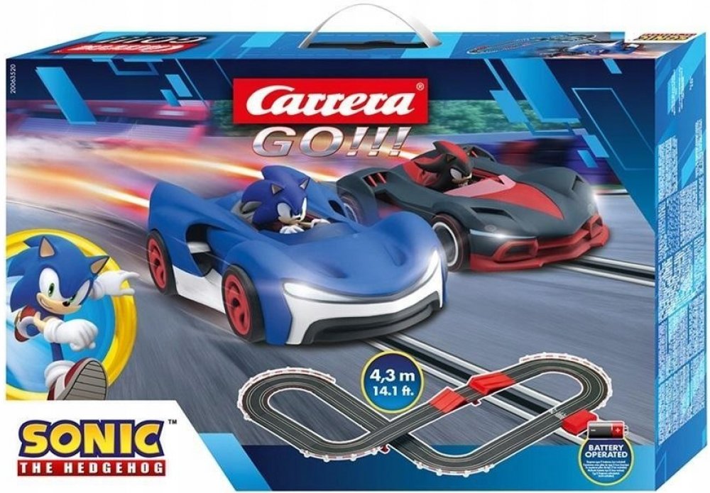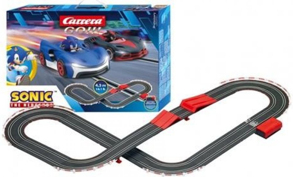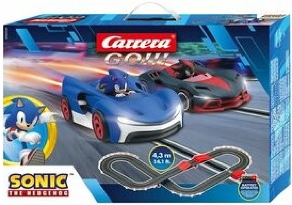 Autodráha Carrera GO!!! dlouhá 4,3m s auty Sonic Speed Star a Shadow Dark Reaper obsahuje skokánek, rovinky, zatáčky, přemostění, napájecí díl na baterie a další díly. Autodráha je kompatibilní s auty a díly GO!!! Do napájecího dílu je možné dát buď baterie nebo trafo.