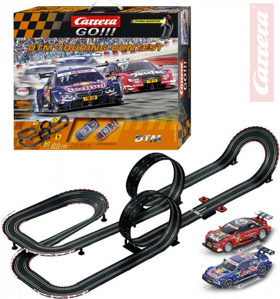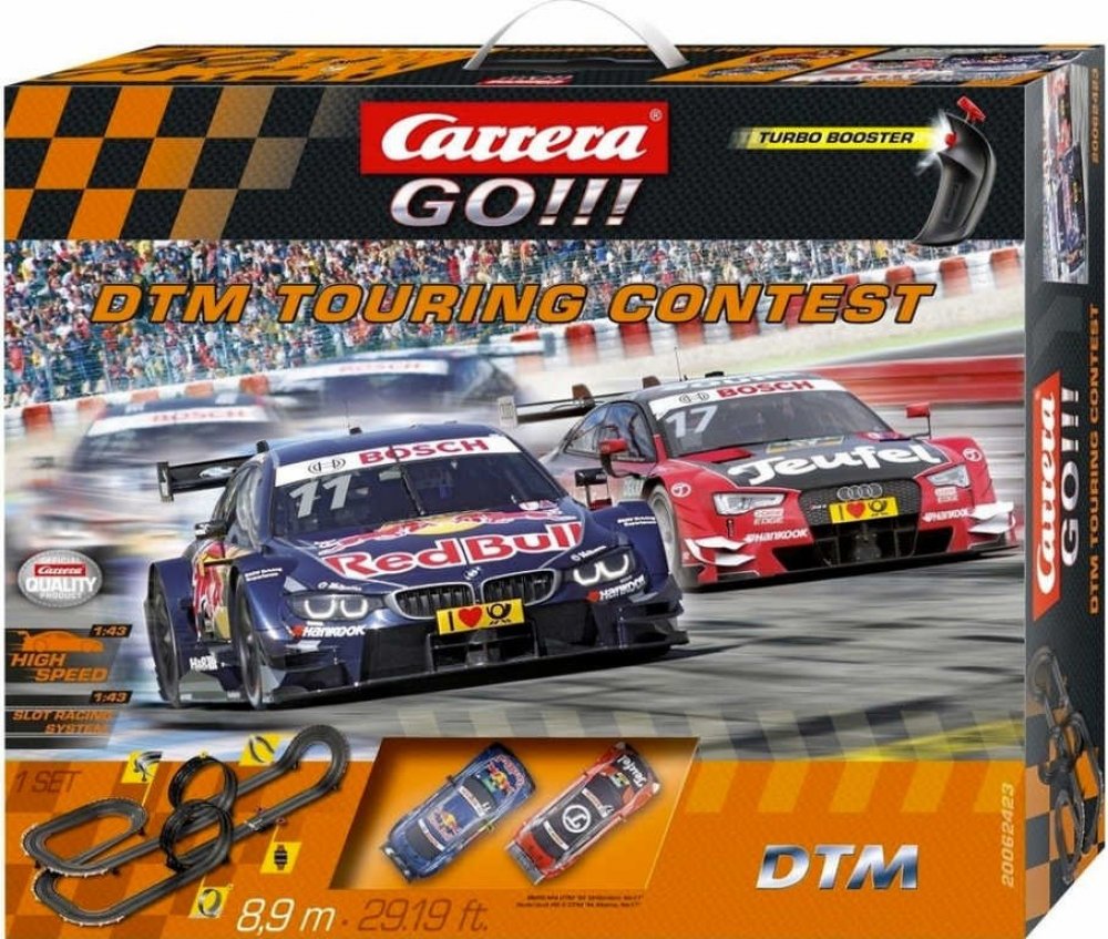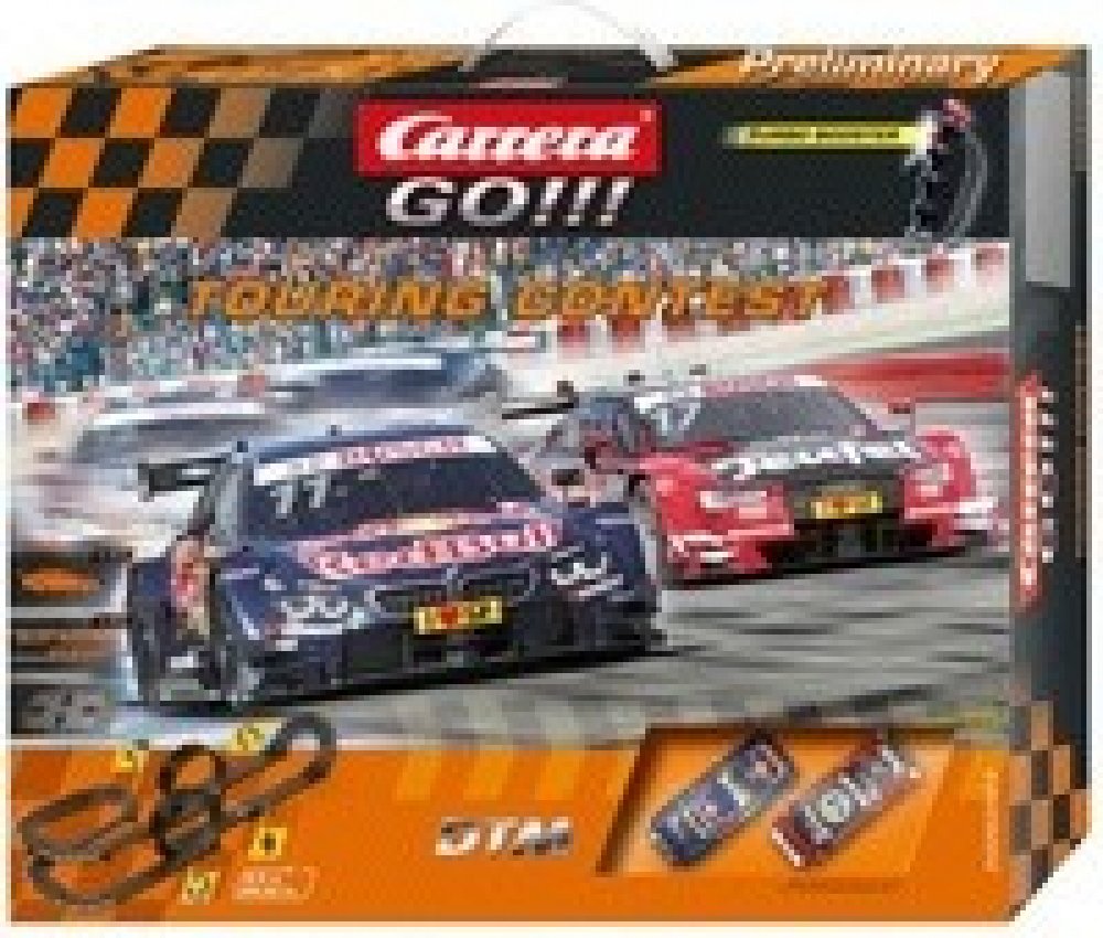 Autodráha CARRERA GO!!! 62423 DTM Touring Contest v sadě se dvěma autíčky, trafem, podpěrami, náhradními kartáčky a dalšími doplňky, pro všechny malé závodníky.GO!!! - To je úvodní řada do světa autodráh Carrera:** Vechny sety jsou vybaveny Turbo ovladačem rychlosti ** Všechna auta mají dvojité kont