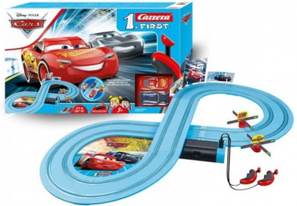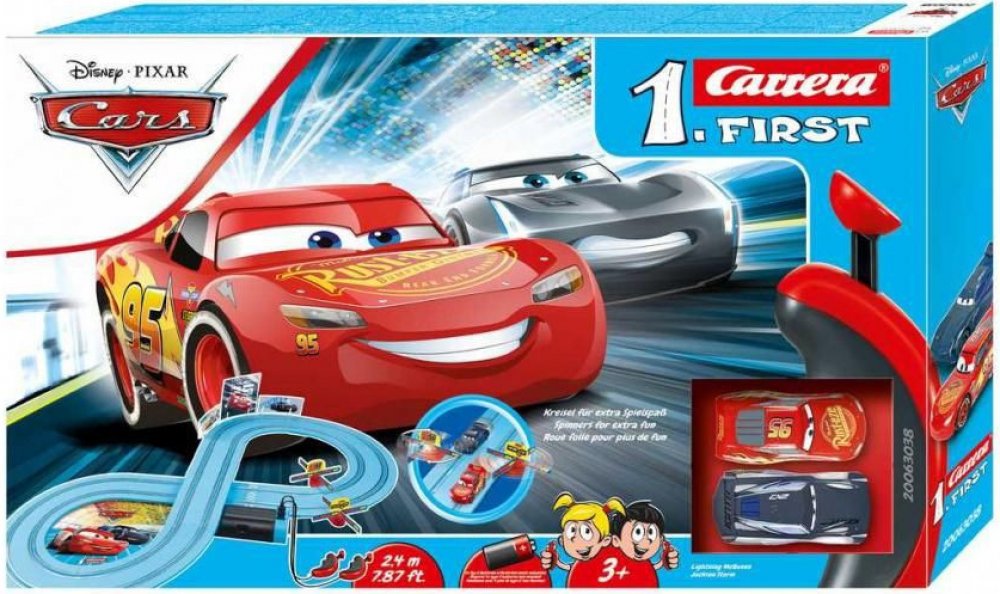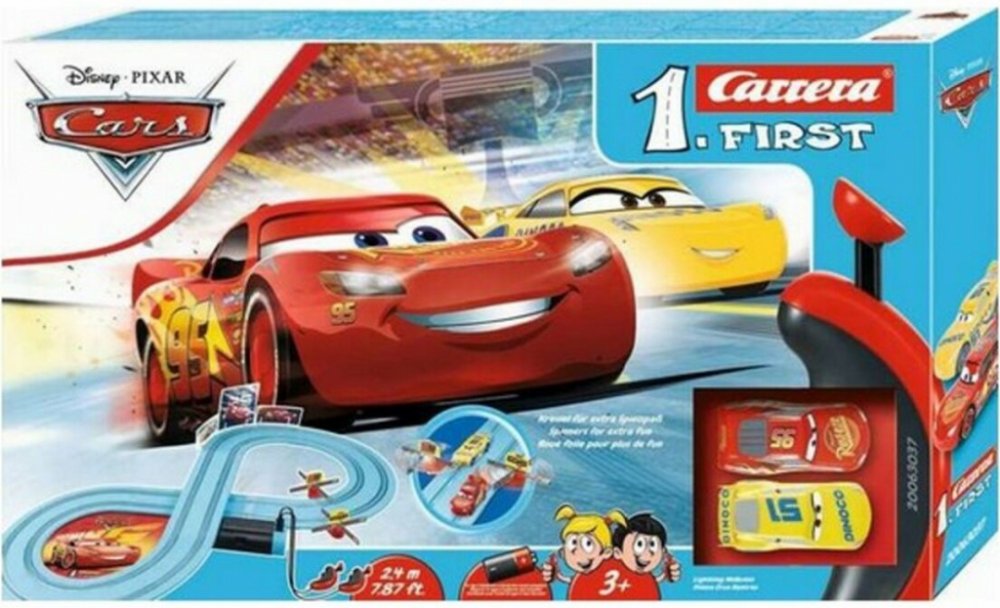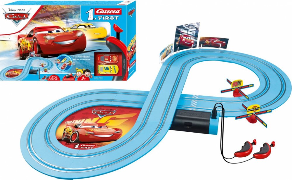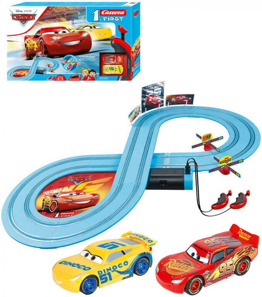 Autodráha Carrera FIRST s auty Blesk McQueen a Dinoco Cruz z filmu CARS pro všechny malé raubíře! Hračka na baterie.