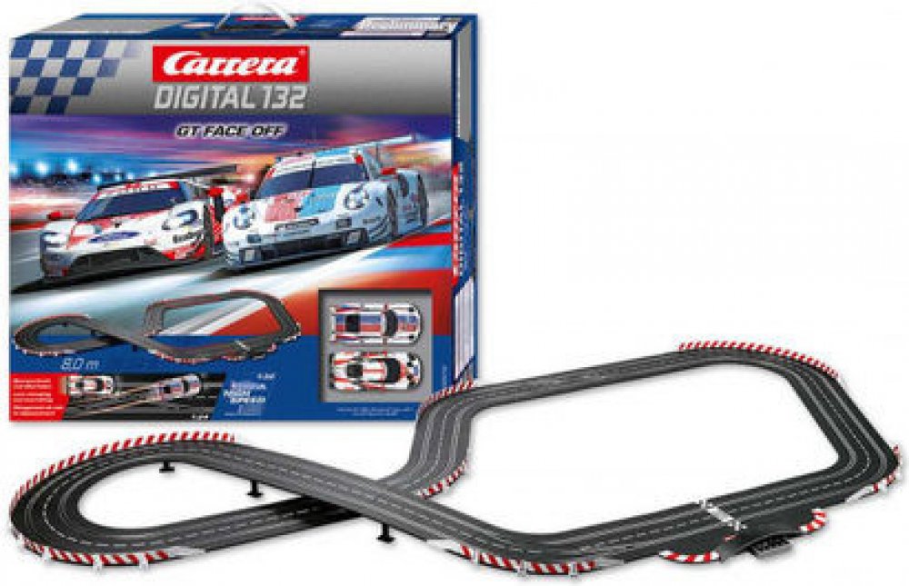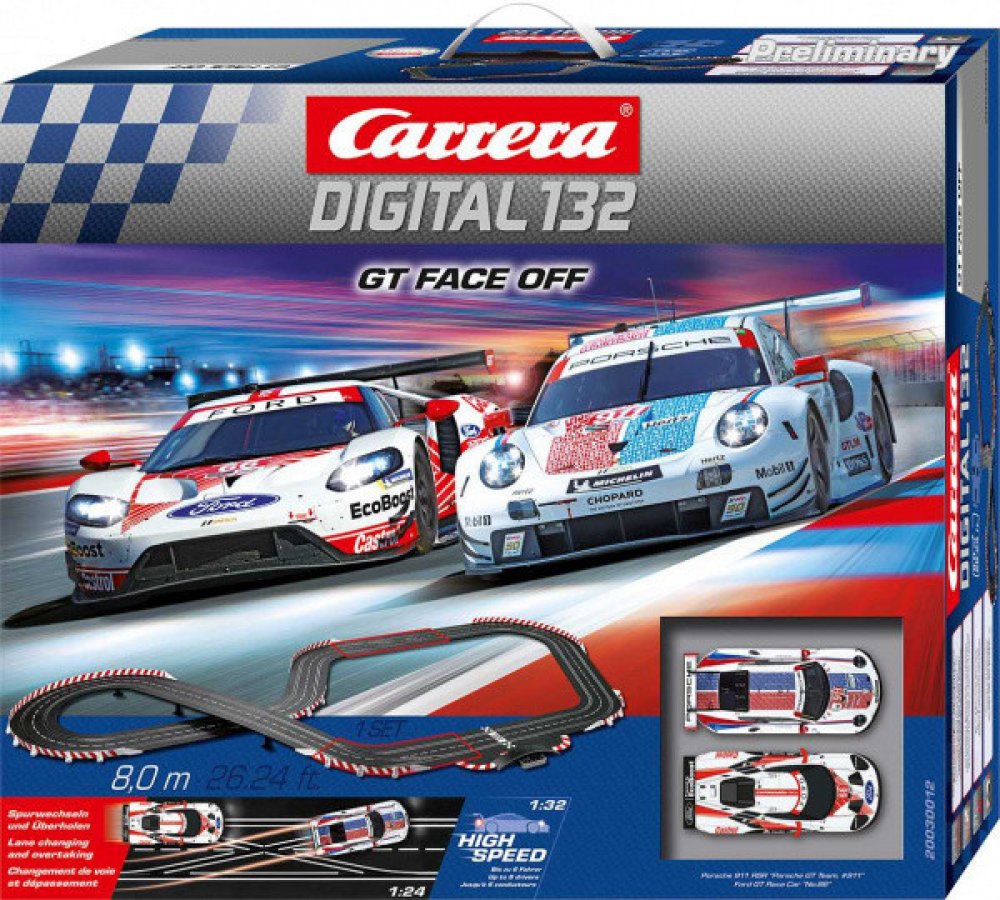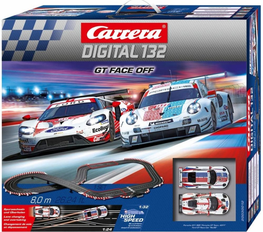 Autodráha Carrera Digital 132 dlouhá 8,0m s auty Porsche 911 RSR a Ford GT Race Car obsahuje rovinky, zatáčky, přemostění, díly na předjíždění na rovince i v zatáčkách, napájecí díl a další díly.