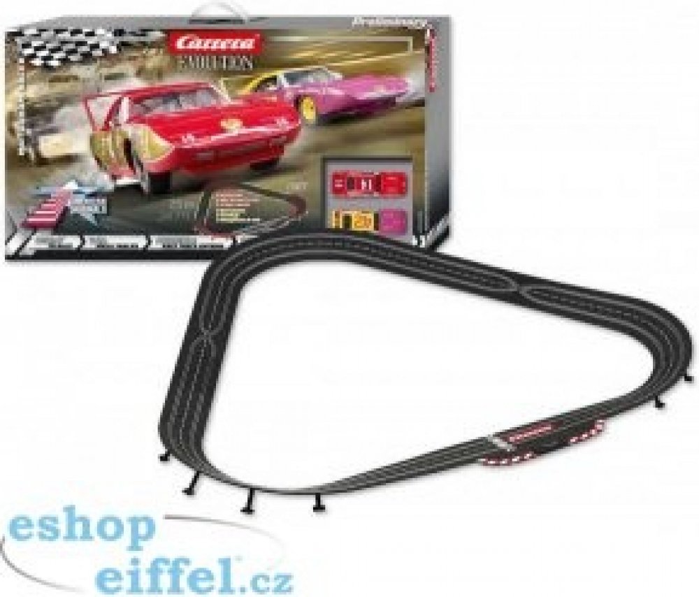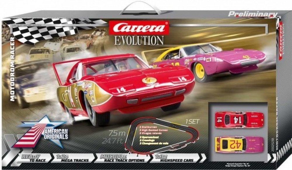 Délka trati: 7,5m.Rozměry po sestavení: 260x 260cm. Nejdelší set Carrera Evolution! Autodráha Carrera EVOLUTIONdlouhá 7,5m s auty Plymouth Superbird a Dodge Charger Daytonaobsahuje křížení dráhy, rovinky, klopené zatáčky, ovladače rychlosti a další díly.
