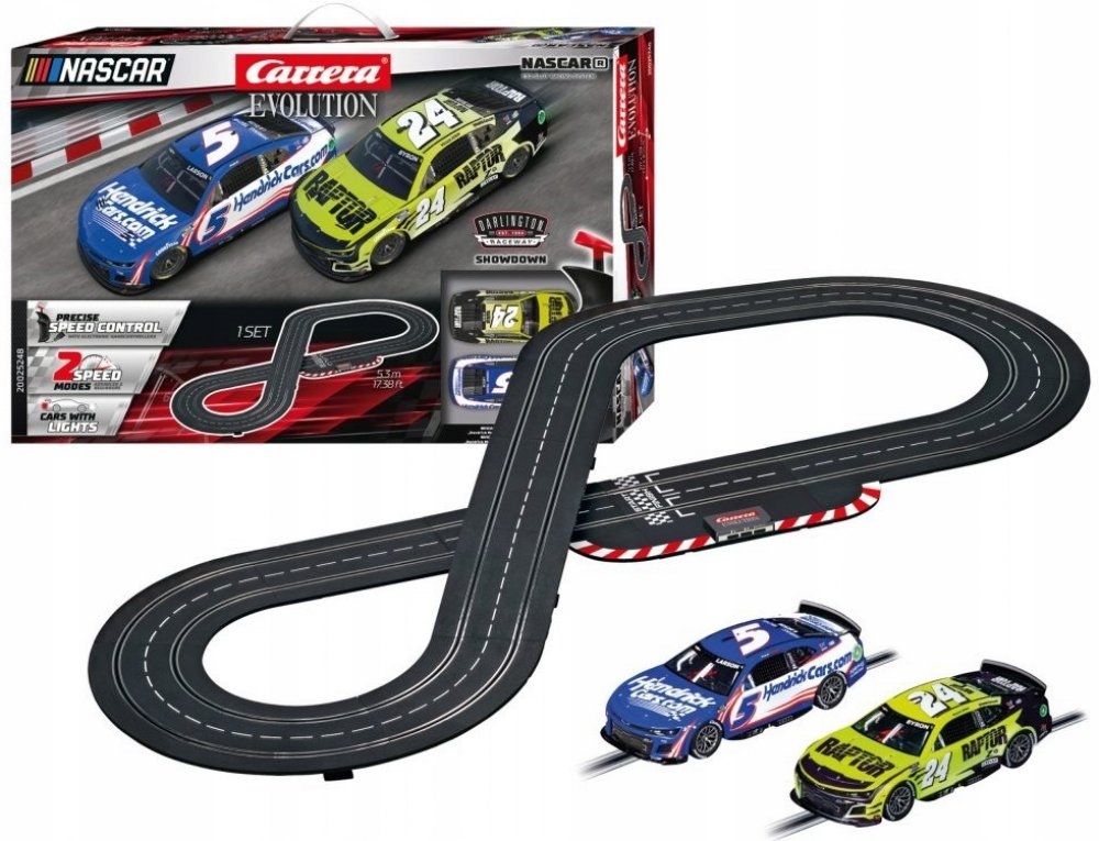 V USA jsou závody NASCAR nejnavštěvovanějším motoristickým sportem. Autodráha Carrera EVOLUTION 'NASCAR' přináší americký výkon motoru do obývacích pokojů světa. S délkou 5,3 metru má tato závodní dráha dlouhé rovinky a zatáčky, takže je ideální pro vysokorychlostní souboje. Dvě auta Chevrolet Camaro NextGen ZL1 ze závodního týmu Hendricks Motorsports vyjíždějí na rošt. Vůz číslo 5 řídí Kaliforňan Kyle Larson, vítěz šampionátu 2021, zatímco vůz číslo 24 závodí týmový kolega William Byron ze Severní Karolíny. Výsledek šampionátu Living Room Cup je nakonec pouze v rukou těch řidičů, kteří drží ovladače Carrera.