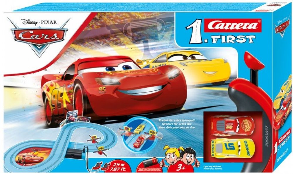 Autodráha Carrera FIRST s auty Blesk McQueen a Dinoco Cruz z filmu CARS pro všechny malé raubíře! Hračka na baterie.