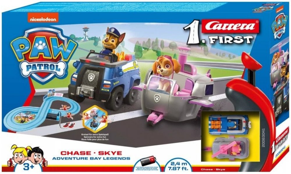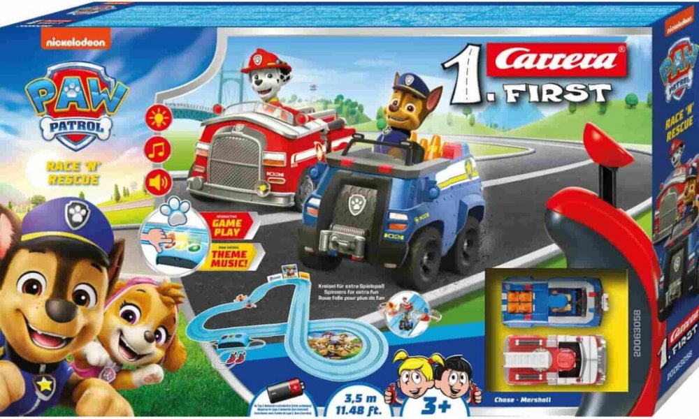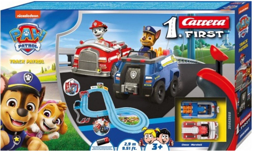 Autodráha Carrera FIRST 2,9 m dlhá autodráha s autíčkami Labková patrola Chase a Marshall, pre deti od 3 rokov, na batérie, obsahuje rovinky, zákruty, bránu pre zábavnejšiu jazdu, ovládače a dekorácie s motívom Paw Patrol.