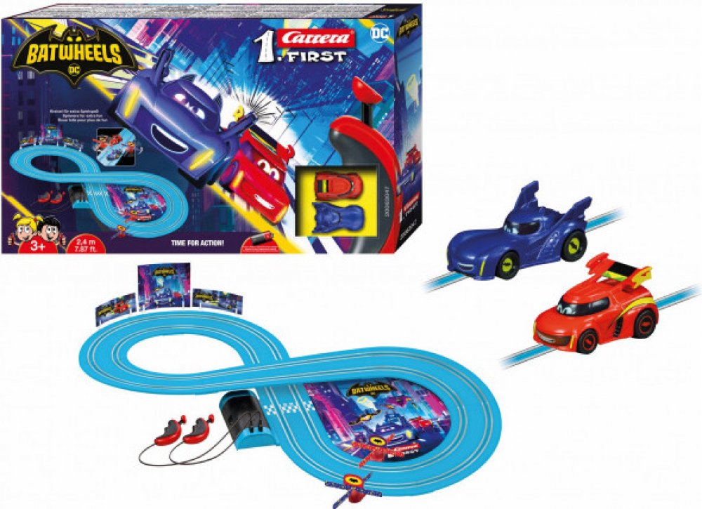 Batwheels z Gothamu berou sérii Carrera FIRST útokem!Sada Carrera FIRST "Batwheels - Time for Action" je ultimátní herní závodní autodráha pro juniorské milovníky dobrodružství ve věku od 3 let! Batmanovo auto skočí do akce v sérii Batwheels. „Bam“ je zkratka pro Batmobile. Celý supervýkonný tým podpory superhrdinských vozidel Gotham bojuje v boji proti zločinu. Bat a jeho kamarád Redbird, Robinovo auto, se také připojí k akci na závodní dráze Carrera FIRST. Dvě malá superauta v měřítku 1:50 závodí na jasně modré dráze 2,4 metru v sadě Batwheels Time for Action. Vrtule zaručují další zábavu při hraní. Autodráha Carrera FIRST je perfektním dárkem, který zajistí, že si začínající závodní jezdci užijí nespočet hodin vzrušení.