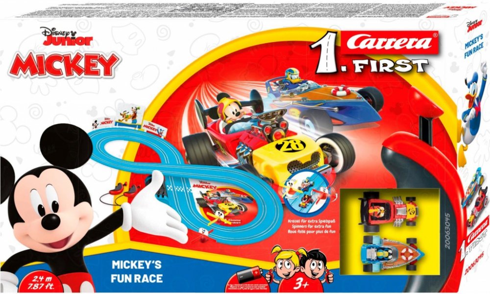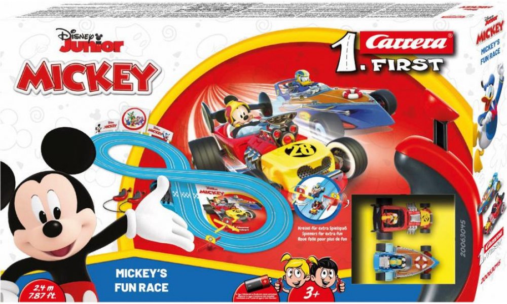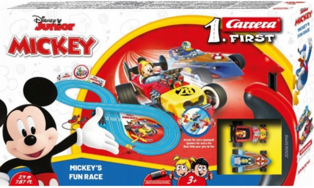 Závodní dráhu s Mickeyho autíčkem č. 28 a Daisyiným autíčkem č. 89 si nyní můžete zahrát ve svém dětském pokoji. Při tvorbě tohoto výrobku věnovala společnost Carrera zvláštní pozornost ztvárnění všech detailů a původních postaviček z filmu Disney Junior. Mickey Mouse v červené helmě a rozkošná Daisy Mouse v růžové helmě s krásnou hráškovou mašlí mohou závodit nárazník na nárazník při superrychlých závodech se svými prvními závodními autíčky.