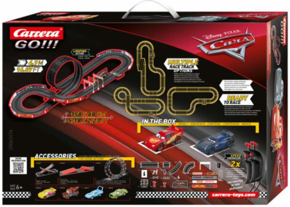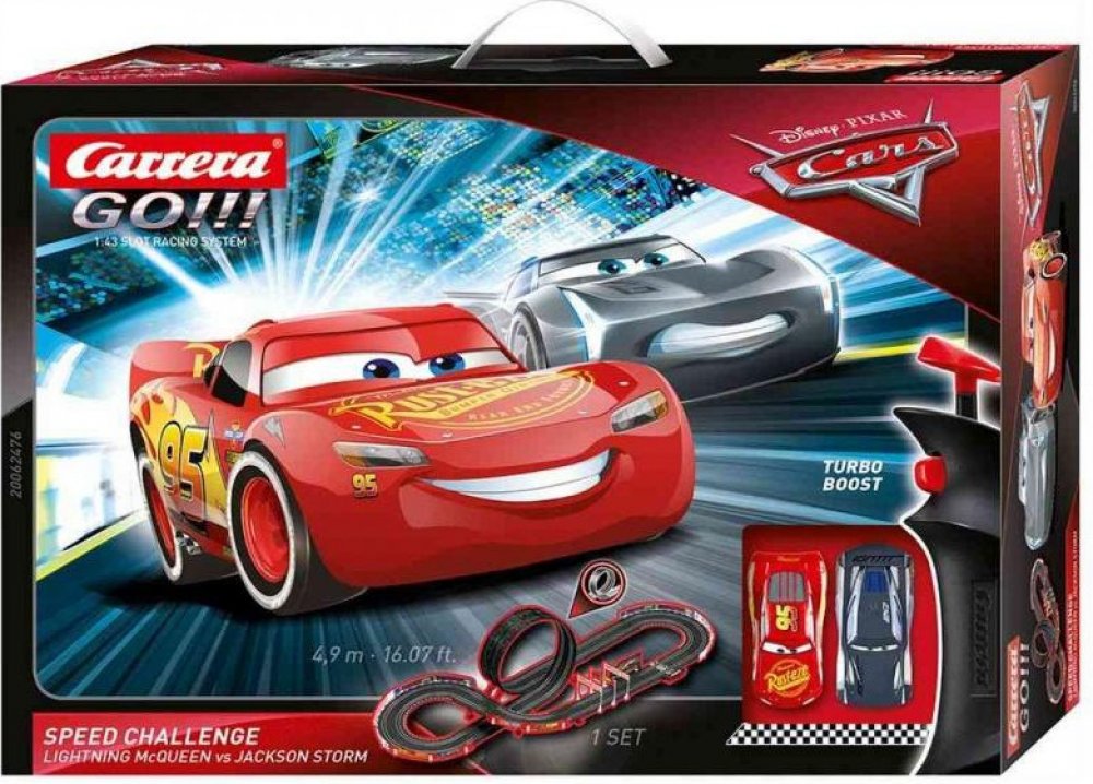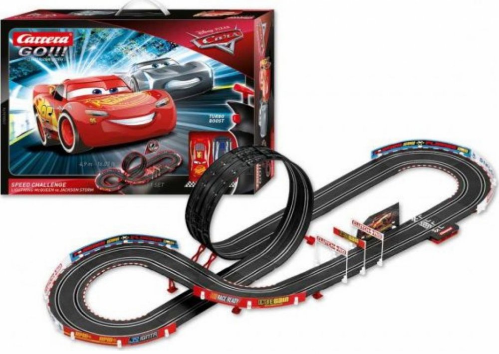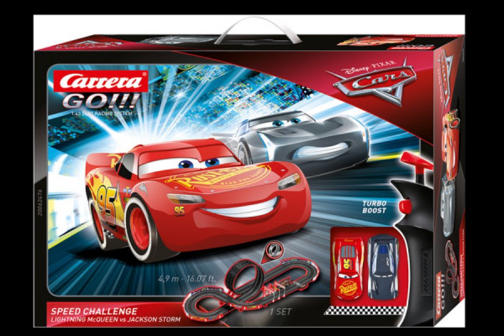 Sestavte si 4,9 metr dlouhou dráhu Carrera GO!!!, na které se rozhodne, jestli mistrem světa bude Disney-Pixar Cars Blesk McQueen, Jackson Storm.