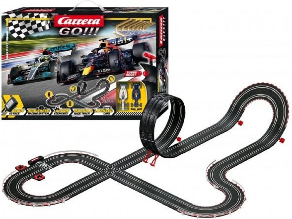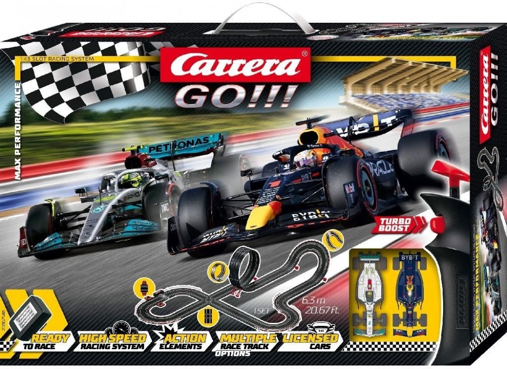 Autodráha Carrera GO!!! dlouhá 6,3m s auty F1 Mercedes a Red Bull, obsahuje looping, křižovatku, kolmou stěnu, rovinky, zatáčky, díl s počítadlem kol a další díly. Můžete si sestavit další různé trati podle své fantazie.