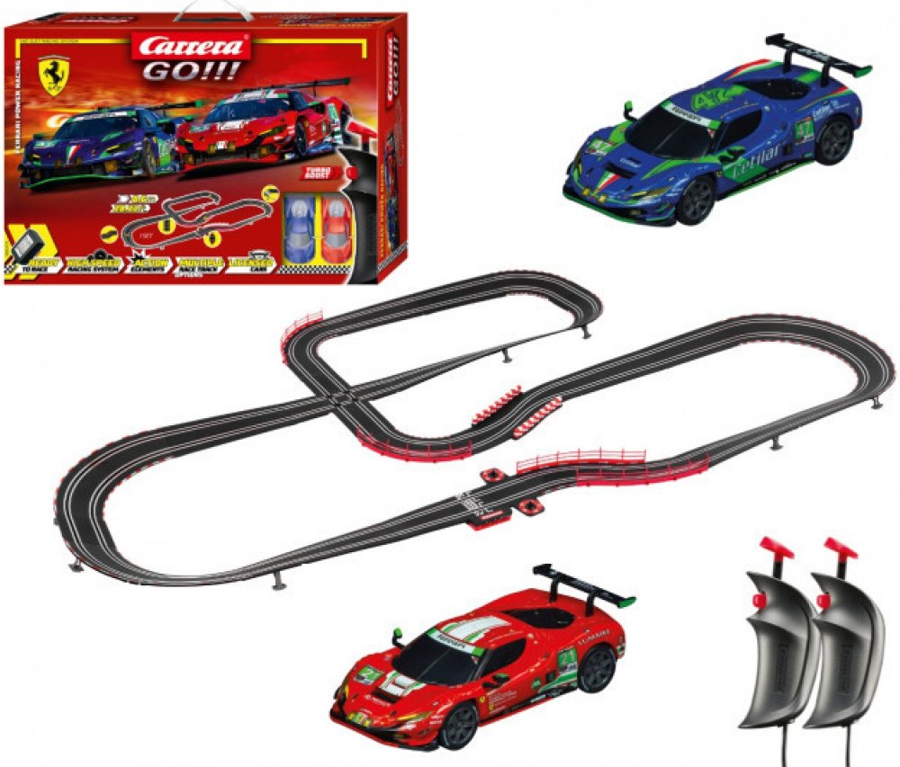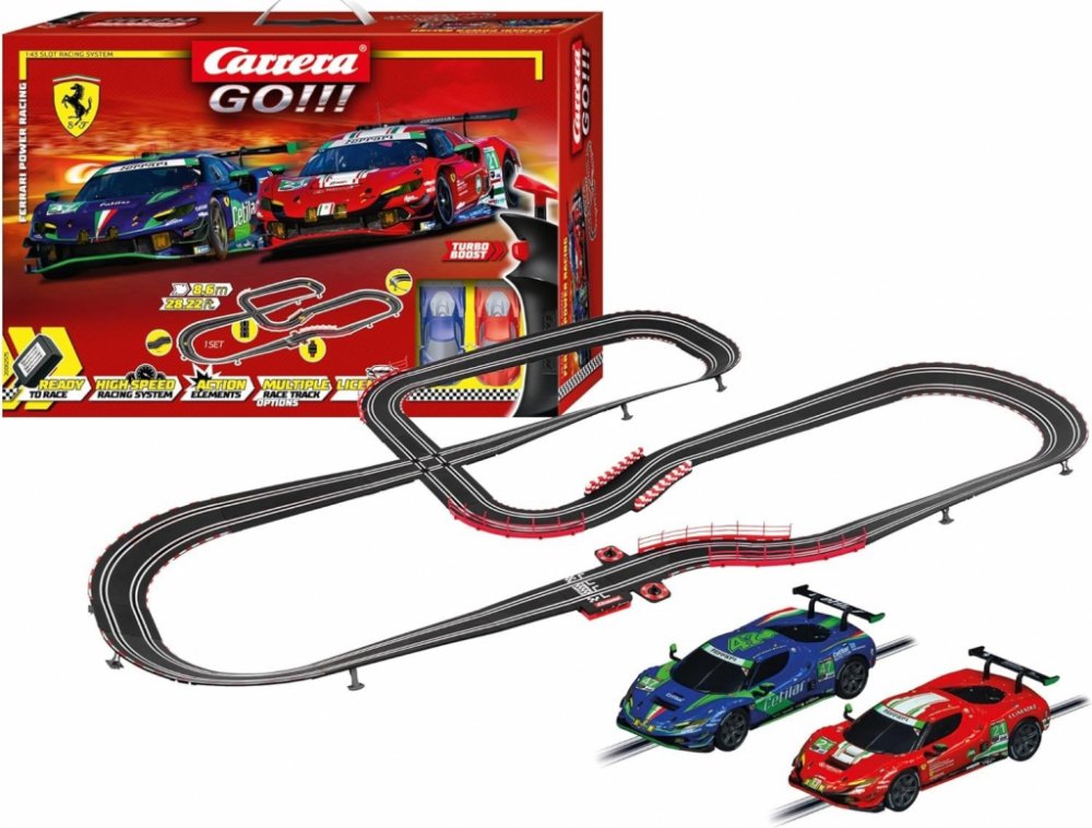 Autodráha Carrera GO Ferrari Power Racing Závodní adrenalinová dráha pro malé závodníky! Autodráha Carrera GO Ferrari Power Racing o délce 8,6 m je ideální volbou pro malé i velké závodníky! S auty Ferrari 296 GT3, včetně modelu "AF Corse, No.21" a "Cetilar Racing, č. 47", zažijete vzrušující závod plný adrenalinu. Sada obsahuje křižovatky, klopené zatáčky, zúžení tratě a počítadlo kol, což činí každou jízdu jedinečnou. Vytvořte si vlastní tratě a prokažte své řidičské schopnosti! Vysoká kvalita zpracování a snadná montáž dělají z této autodráhy perfektní dárek pro každého malého závodníka.