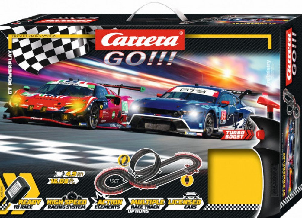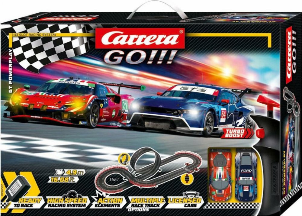 Carrera GO!!! - GT Powerplay je závodní dráha, která přináší vzrušení z profesionálního šampionátu GT přímo do vašeho pokoje! Na trati dlouhé 4,9 metru se střetnou dva jedinečné modely: Ford Mustang GT3 "Ford Multimatic Motorsports, č. 64" a Ferrari 296 GT3 "AF Corse, č. 21" - oba reprodukované s pečlivou pozorností k detailům. Trať nabízí rychlé rovinky, ostré zatáčky a velkolepou smyčku, které zaručují nezapomenutelné adrenalinové závody. Díky funkci Turbo Boost mohou řidiči zrychlit své vozy do závratných rychlostí a bojovat o nejlepší čas na kolo. Jedná se o sadu, která vám umožní nejen dynamicky závodit, ale také pocítit skutečnou atmosféru motorsportu - každá zatáčka a každé předjíždění se počítá až do samotného cíle. Carrera GO!!! je systém v měřítku 1:43, který je ideální jak pro začínající fanoušky závodů, tak pro zkušené nadšence do autodráh. Věk: 6+. Měřítko: 1:43. Délka trati: 4,9 metru. Ford Mustang GT3 Ford Multimatic Motorsports, č. 64 Ferrari 296 GT3 AF Corse, č. 21 Transformer, spojovací část, počítadlo kol, dvourychlostní regulátor, rovinky, zatáčky, smyčky, podpěry, svodidla