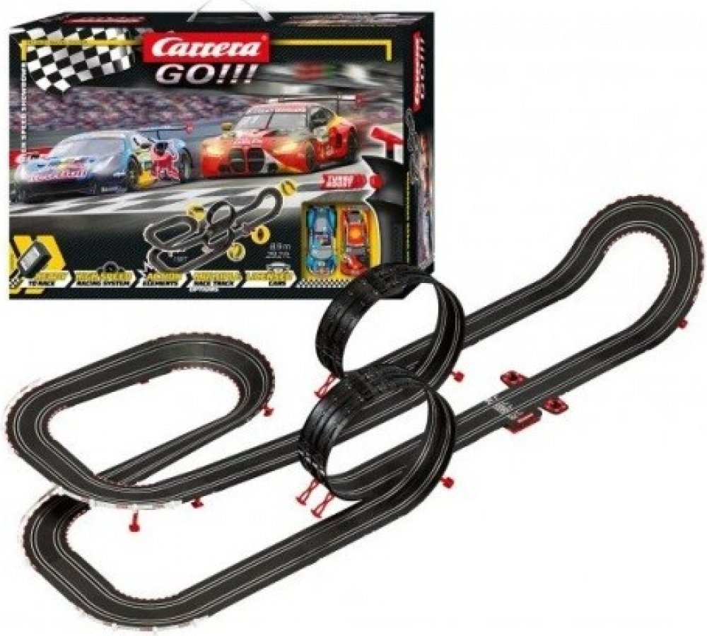 Autodráha Carrera GO!!! dlhá 8,9 m s autami BMW M4, Ferrari 488, Audi R8 LMS, obsahuje premostenie, rovinky, zákruty, kolmú stenu, klopenú zákrutu, looping, diel s počítadlom kôl a ďalšie časti. Môžete si postaviť ďalšie rôzne trate podľa svojej fantázie.