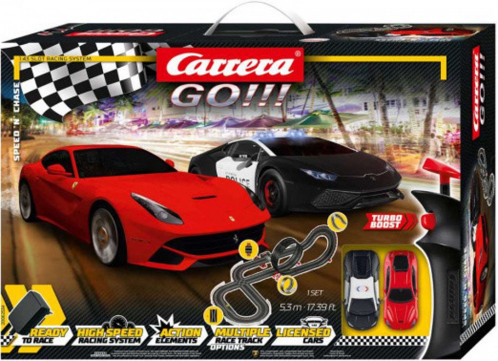 Autodráha Carrera GO!!! – Speed´n Chase Carrera. Autodráhy, Carrera. Autodráha Carrera GO!!! dlouhá 5,3 m s auty Ferrari F12 a Lamborhighi Huracán Police obsahuje křižovatku, zúžení dráhy, kolmou stěnu, looping, rovinky, zatáčky, díl s počítadlem kol a další díly. Můžete si sestavit další různé trati podle plánu na obalu.
