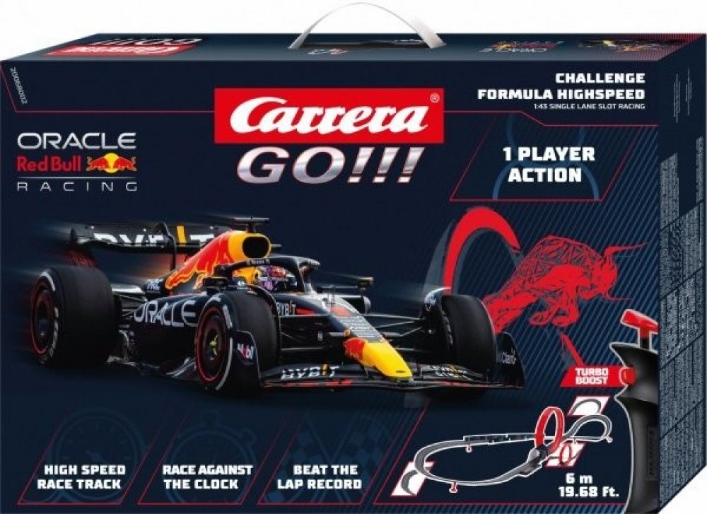 Autodráha Carrera GO!!! dlouhá 6m s autem Formula 1 Red Bull, obsahuje looping, klopenou zatáčku, kolmou stěnu, rovinky, zatáčky, díl s počítadlem kol a další díly. Jedna dráha, jedno auto, jeden ovladač. Délka trati: 6 m. Rozměry po sestavení: 203 x 75 cm.Hloubka (mm): 100 (mm)Šířka (mm): 580 (mm)Výška (mm): 400 (mm)Váha (kg) - netto bez obalu: 2,943 (kg)Váha (kg) s obalem: 2,943 (kg)Hmotnost: 2,...