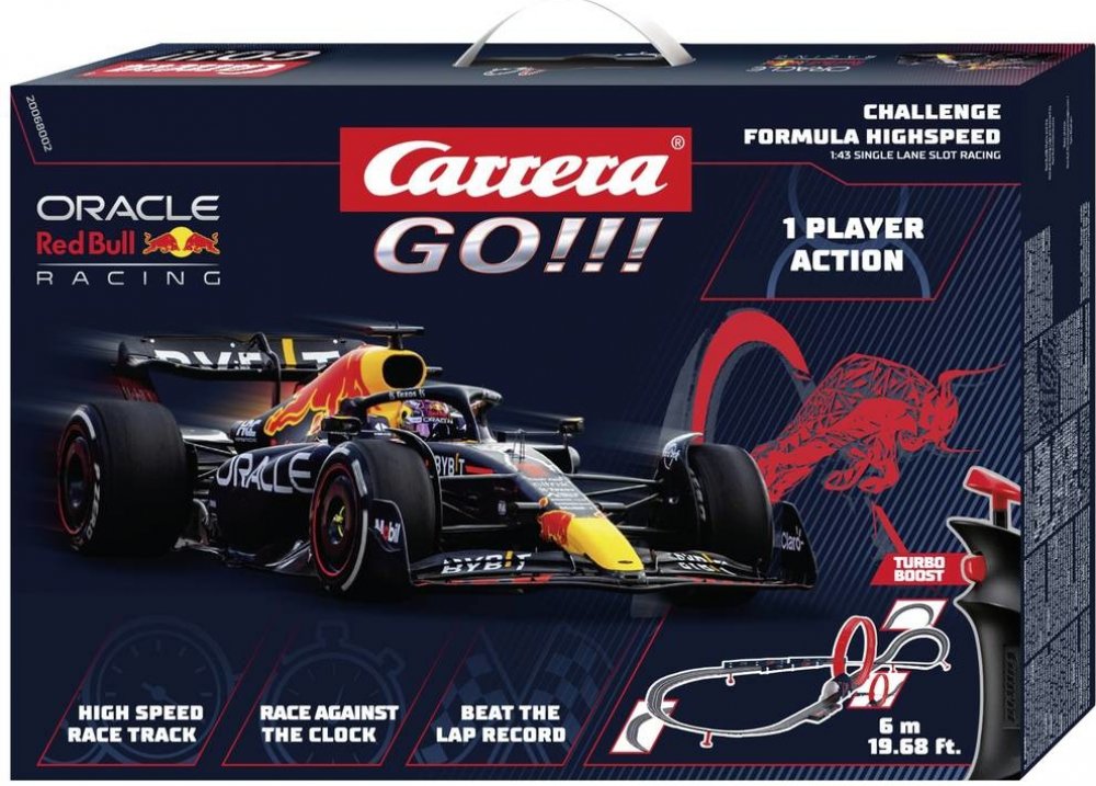Autodráha Carrera GO!!! dlouhá 6m s autem Formula 1 Red Bull, na adptér, obsahuje looping, klopenou zatáčku, kolmou stěnu, rovinky, zatáčky, díl s počítadlem kol a další díly.