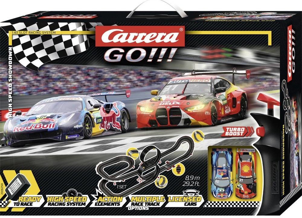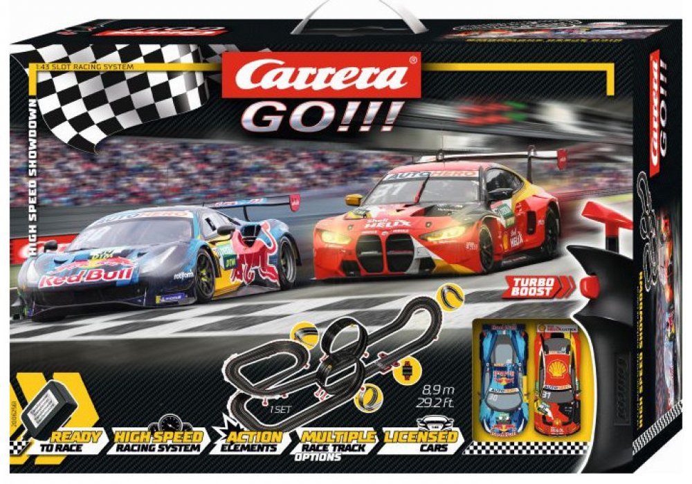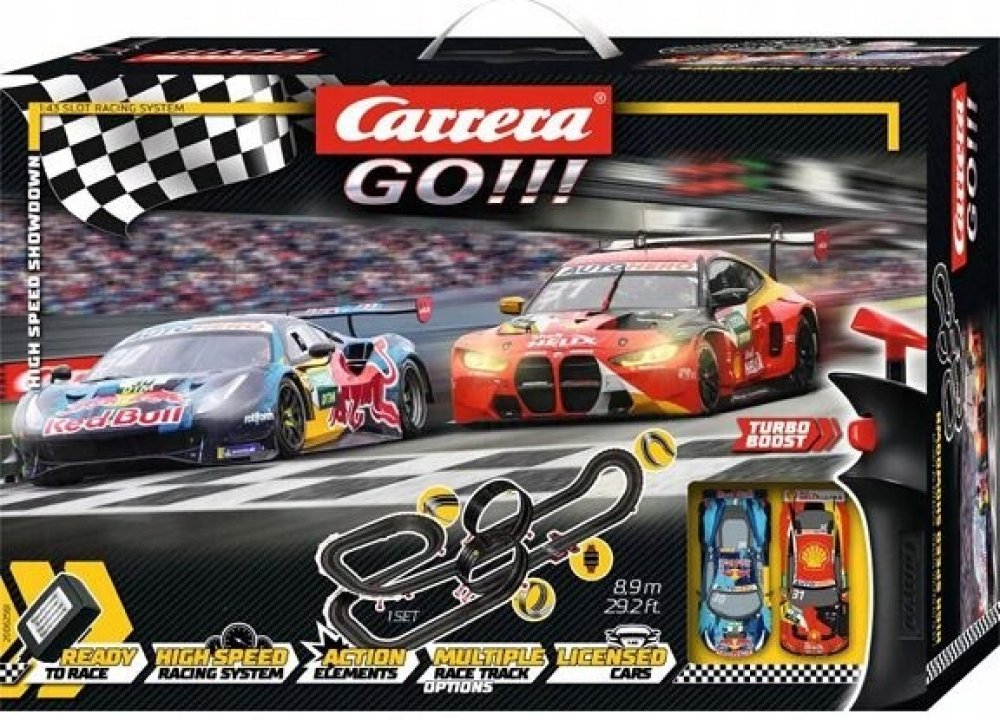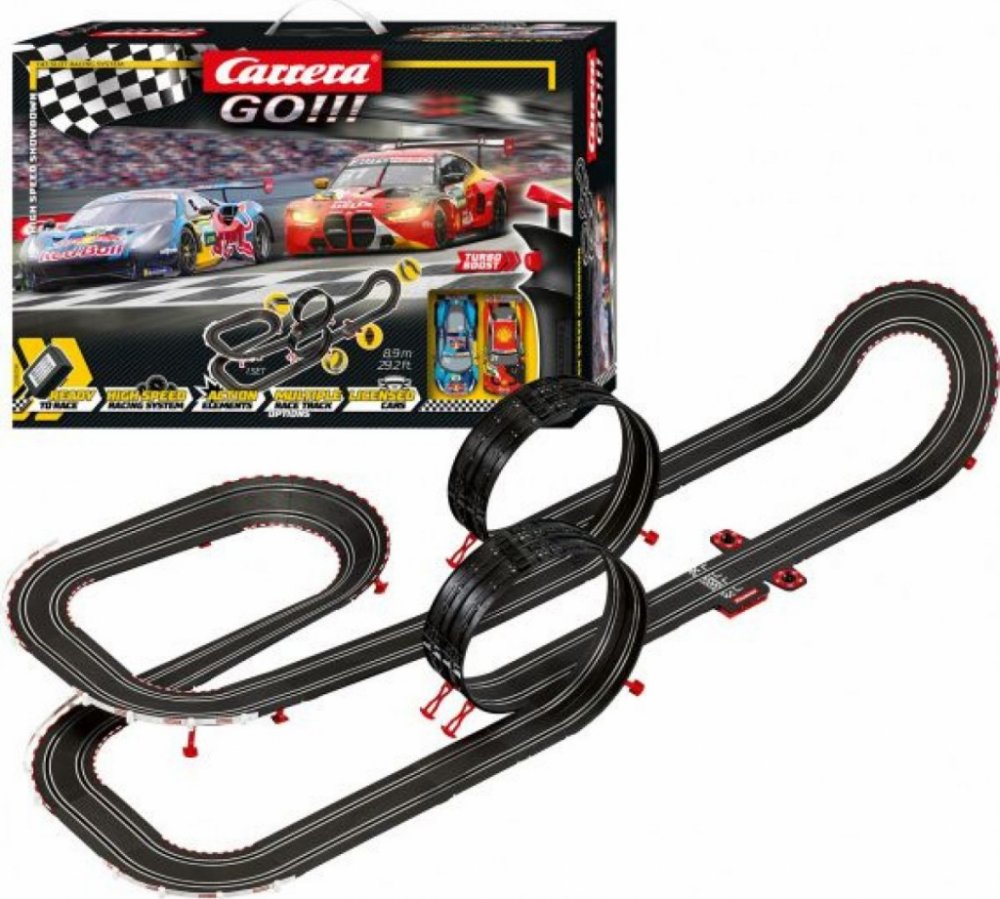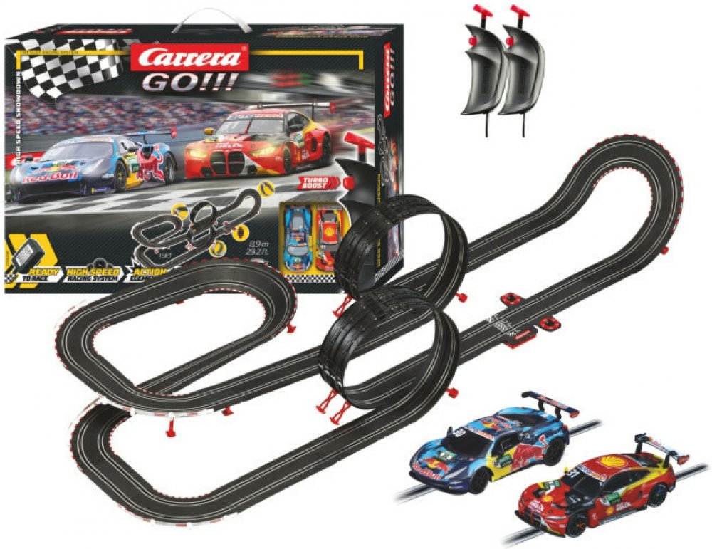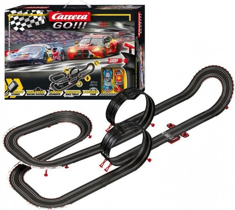 Autodráha Carrera GO!!! dlouhá 8,9m s auty BMW M4 GT3 a Ferrari 488 GT3, obsahuje dva loopingy, klopenou zatáčku, kolmou stěnu, rovinky, zatáčky, díl s počítadlem kol a další díly. Můžete si sestavit další různé trati podle své fantazie.