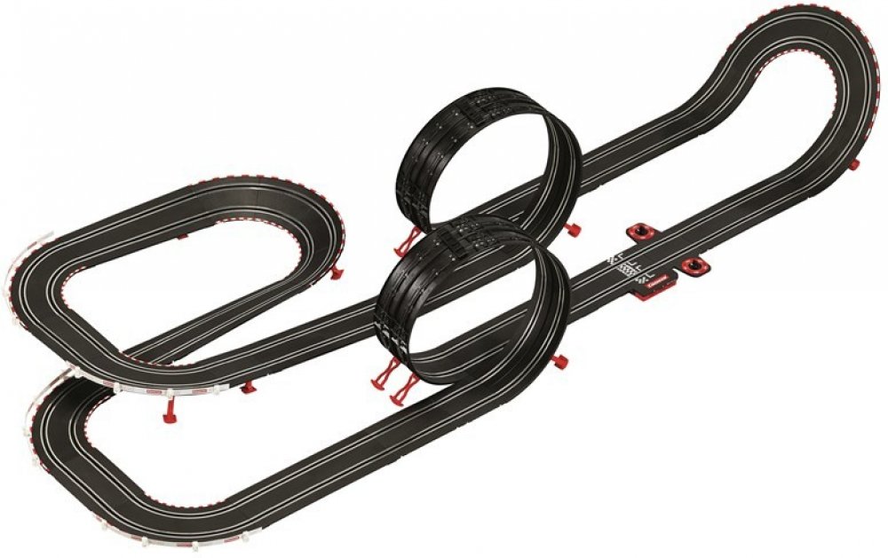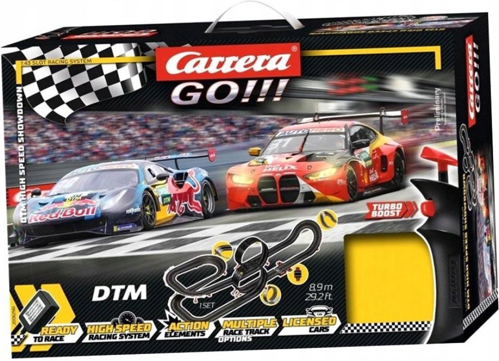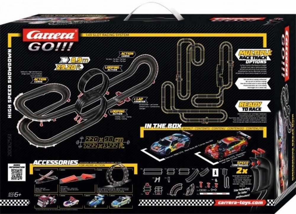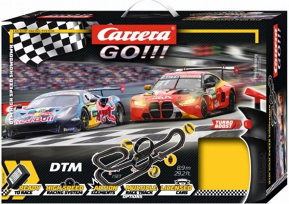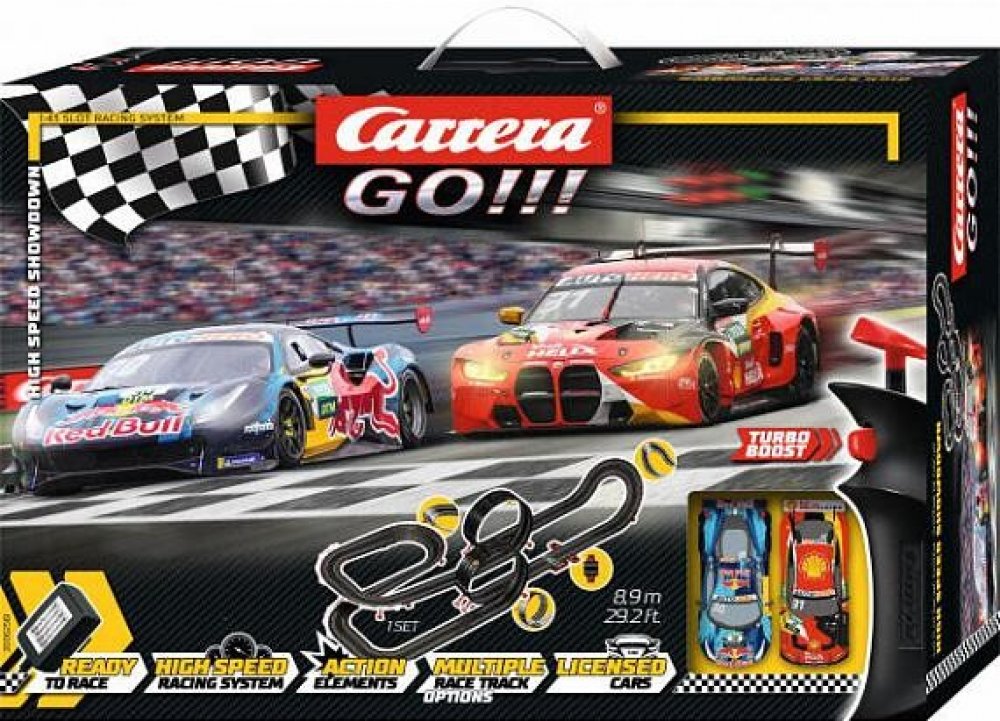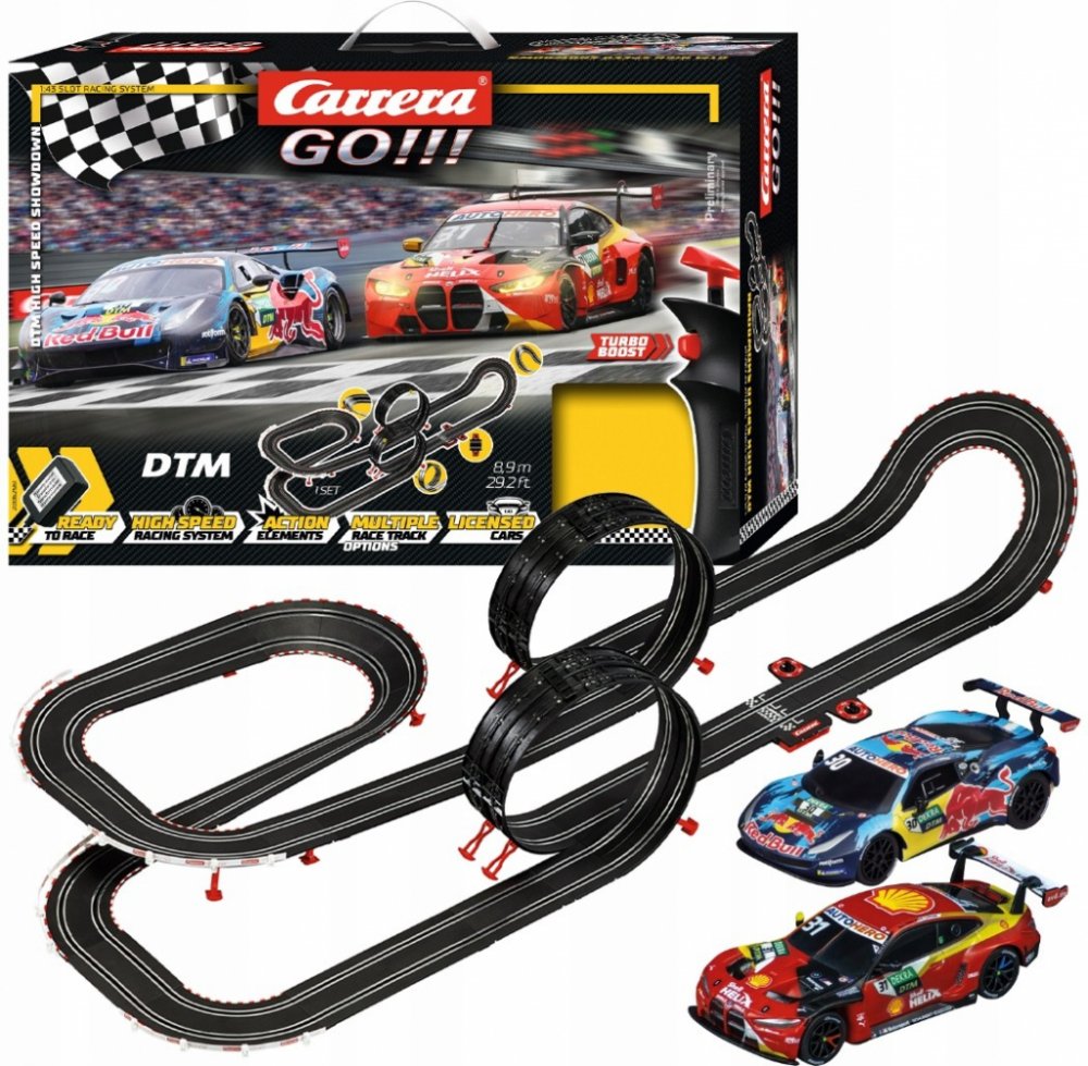 Autodráha Carrera GO!!! dlouhá 8,9m s auty BMW M4 GT3 a Ferrari 488 GT3, obsahuje dva loopingy, klopenou zatáčku, kolmou stěnu, rovinky, zatáčky, díl s počítadlem kol a další díly. Můžete si sestavit další různé trati podle své fantazie.