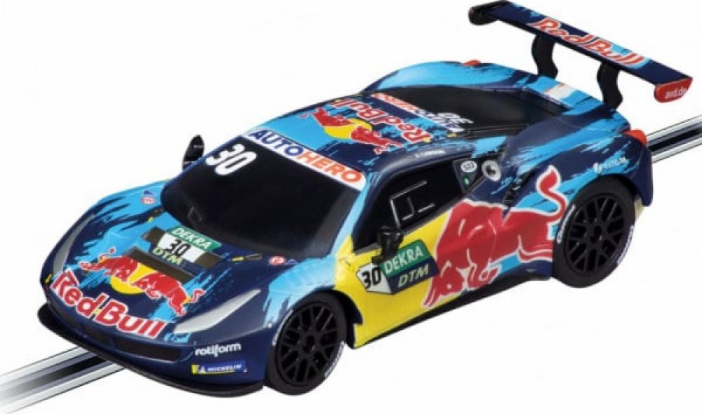 Obsah balení: 1x auto BMW M4 GT3 DDTM "Sheldon van der Linde, No.31" 1x auto Ferrari 488 GT3 "Red Bull AF Corse, No.30" rovinky kolmá stěna dva loopingy zatáčky, klopené zatáčky 1x napájecí díl (61666) 1x díl s počítadlem kol (88107) 2x ovladač rychlosti (61663) 1x trafo Podpěry, mantinely, náhradní kontaktní kartáčky, náhradní vodící lišty, návod