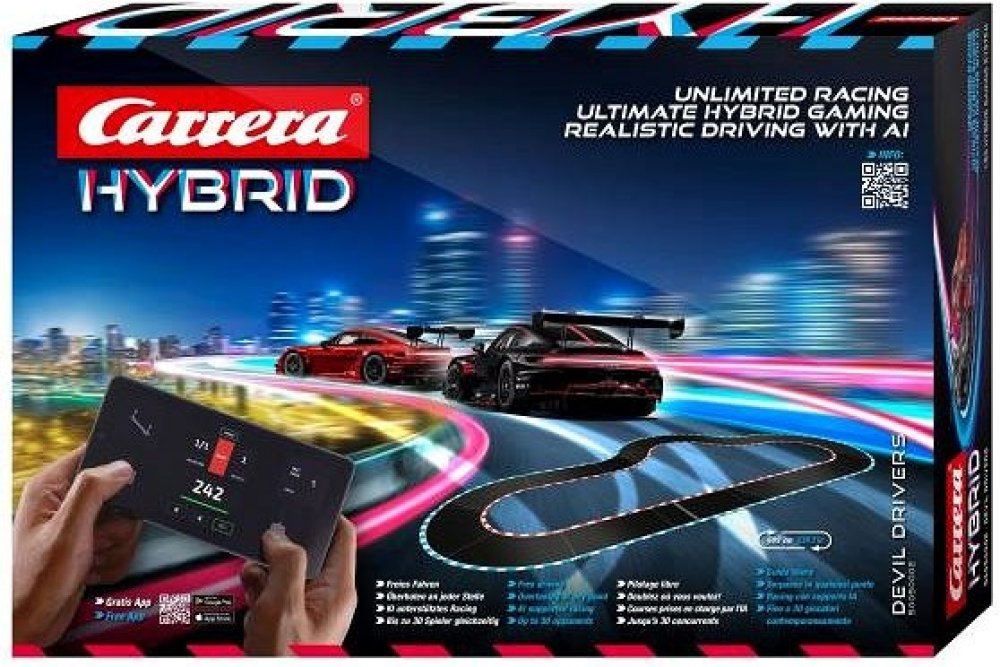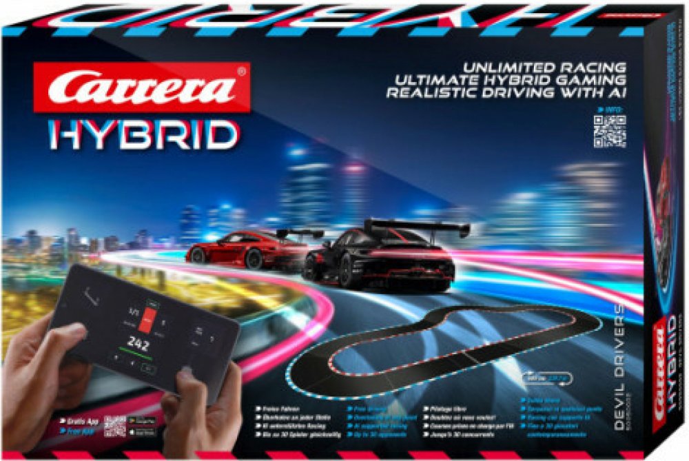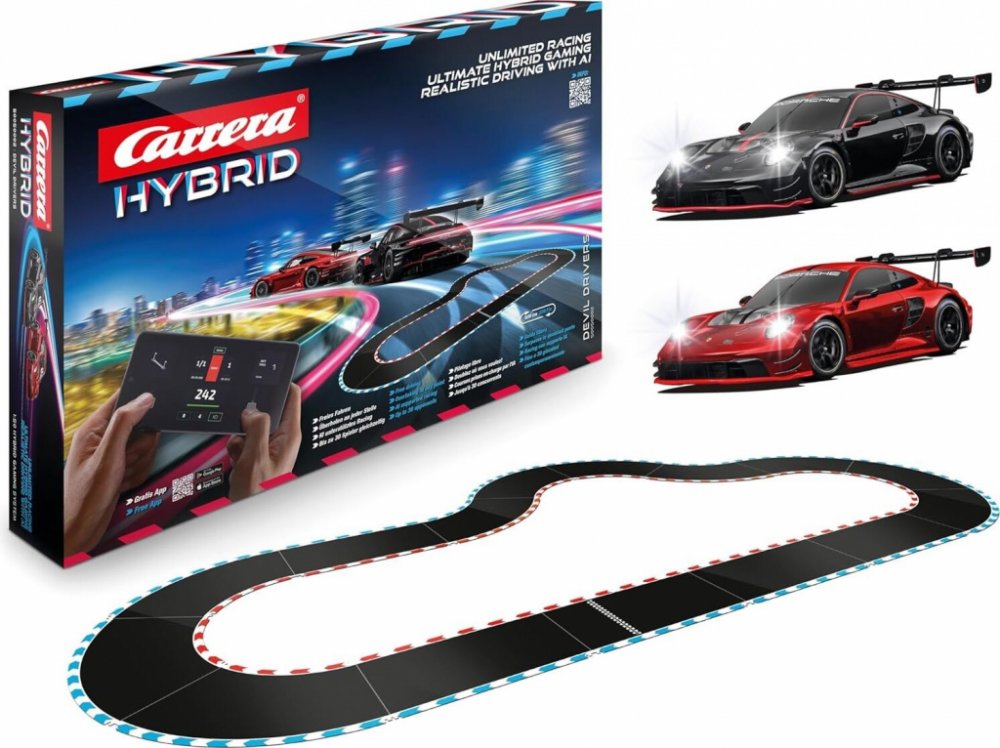 Nová řada autodráh Carrera - Hybrid nabízí dokonalou kombinaci herní a závodní zábavy. Podpora umělé inteligence umožňuje realistický zážitek z jízdy v různých jízdních režimech. Ovládání pomocí aplikace Carrera Hybrid. Jízda i předjíždění po trati i mimo ni. Závody až pro 16 závodníků. Nastavení aut pomocí AI. Auta v měřítku 1/50. Online závodění. Odemknutí různých úrovní obtížnosti.