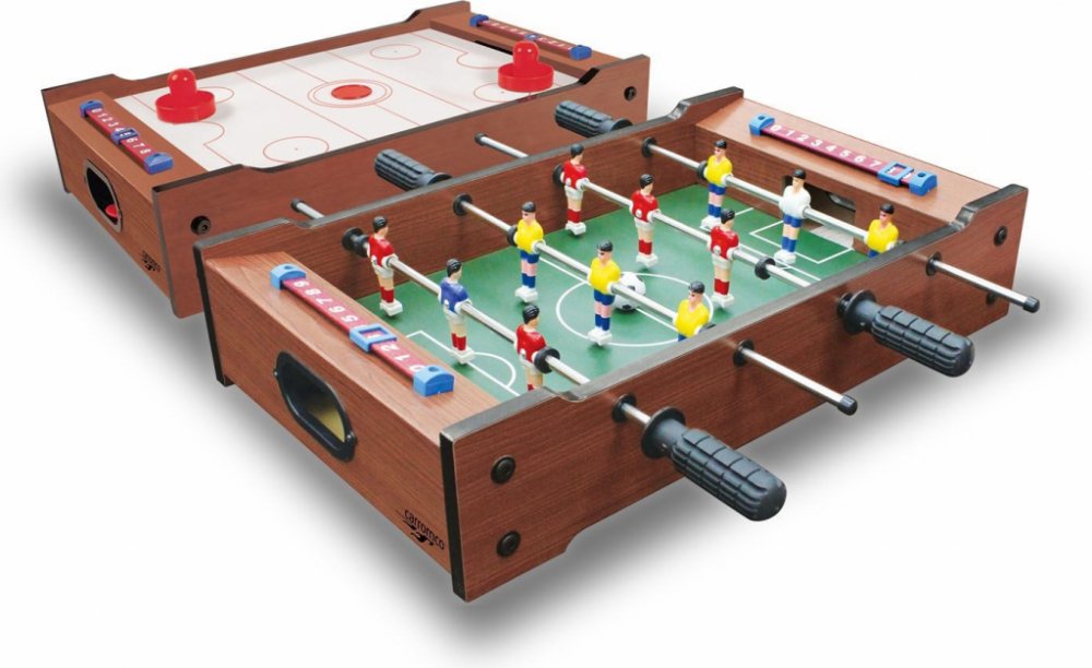 Multifunkční hrací stůl pro více hráčů v dřevěném dekoru 2 skvělé hry – stolní fotbal a hokej 4 ocelové tyče s ochrannými krytkami 12 červeno-bílých a žluto-modrých hracích figurek (6 pro každý tým) Brankáři v jiných barvách Na každé straně 2 ruční počítadla skóre Rozměry cca 51 x 31 cm Výška: cca 10,5 cm Hmotnost cca 2,9 kg