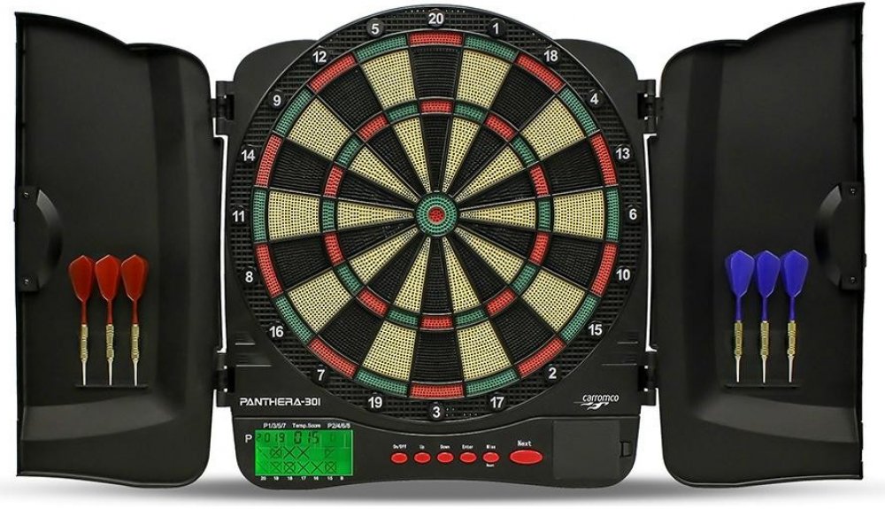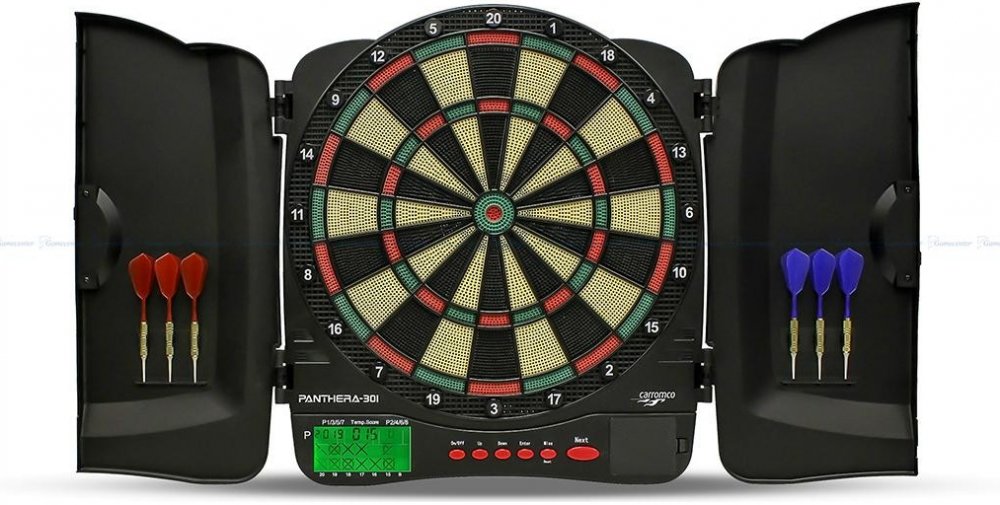 Elektronický terč PANTHERA 301 s kabinetem Kvalitní elektronický terč německého výrobce Carromco.Možnost hry : 1-8 hráčů30 základních her, 500 variant,Velký LCD zobrazovací displejŠiroké čtyřdílné segmenty (double a triple)Funkce HandycapPříslušenství tvoří : 6 ks šipek, 20 ks náhradních plastových hrotůProvoz na 3xAA baterie (nejsou součástí balení)Rozměry: 46 x 48 x 3.8 cmHmotnost: 1,32 kgNa elektroniku pokytujeme záruku jeden rok při používání v domácnosti nikoli v klubech.Používat šipky maximálně 16g !!!
