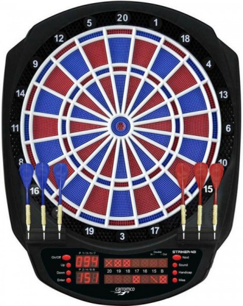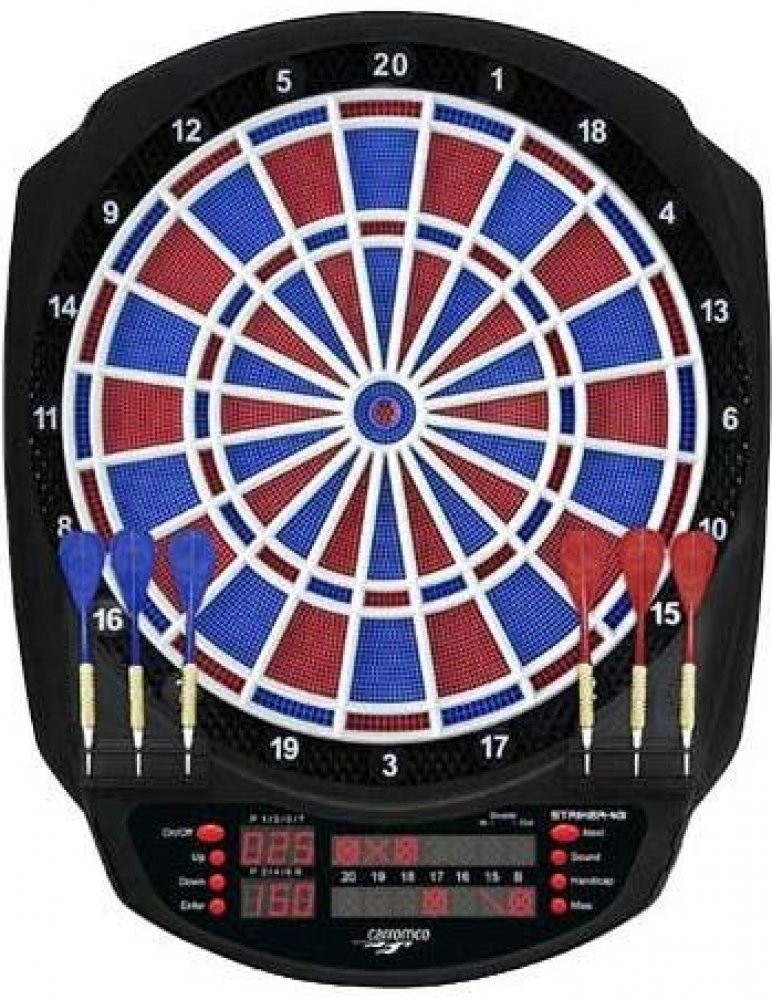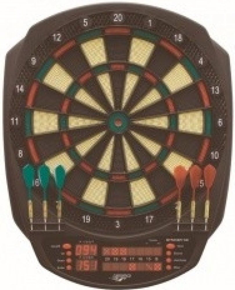 Moderní elektronický terč na šipky německé firmy Carromco pro 1 až 8 hráčů. Terč nabízí 35 her s 584 variantami s možností hry jednoho hráče proti počítači. Potřebné údaje zobrazují 4 přehledné LCD displeje a nastavitelné zvukové efekty. Napájení na síťový adaptér.