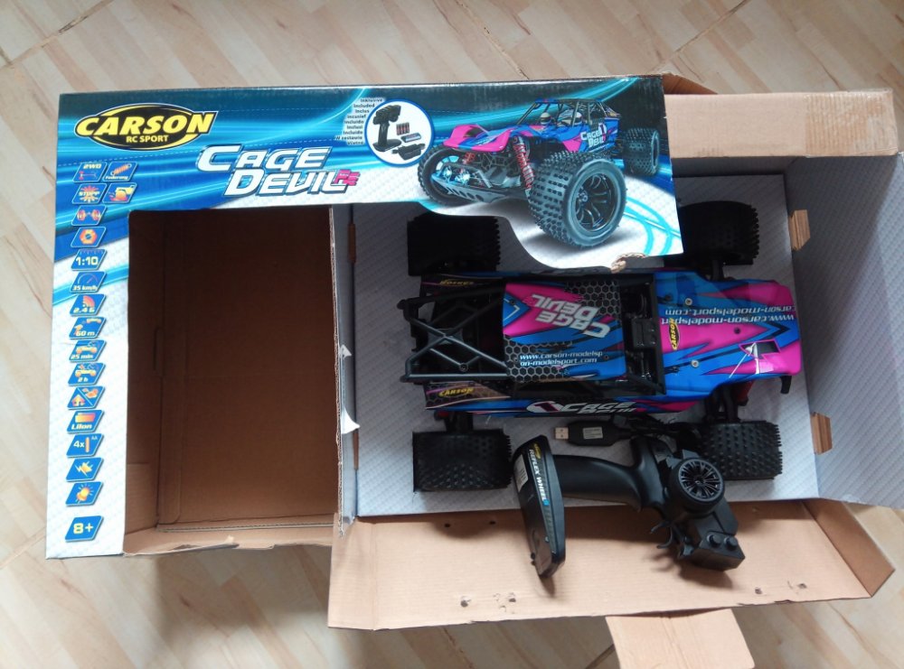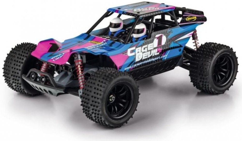 Cage Devil je rychlý teréňák z řady Fast-Entry společnosti CARSON Modelsport, který může dosáhnout rychlosti 35 km / h. Dálkové ovládání 2,4 GHz. Nově navržený podvozek je pro jakýkoliv drsný terén. Elektronická jednotka chráněná proti stříkající vodě umožňuje jízdu i na mokré zemi. Zajímavým prvkem je propracovaný design karoserie s čísly řidičů a předními a zadními LED diodami. Vysoce přilnavé, terénní pneumatiky.Pohon zadních kol. Vysoce výkonný akumulátor Liion. Baterii lze upevnit do modelu zespodu, takže není nutné odstraňovat plášť karoserie. Balení 100% RTR včetně všech potřebných baterií.