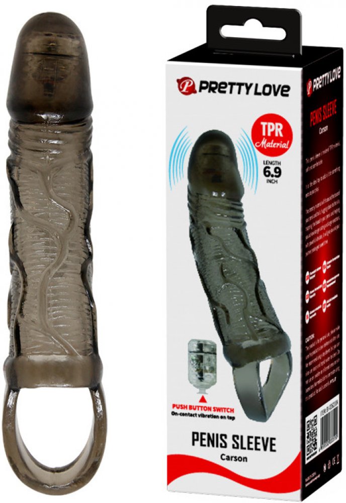 Pretty Love Carson Stimulační návlek na penis Speciální stimulační návlek na penis s vibrací. Vibrační motorek je umístěn ve špičce návleku. Součástí návleku je kroužek, který se uchytí pod varlata a promyšleně tak návlek stabilizuje.